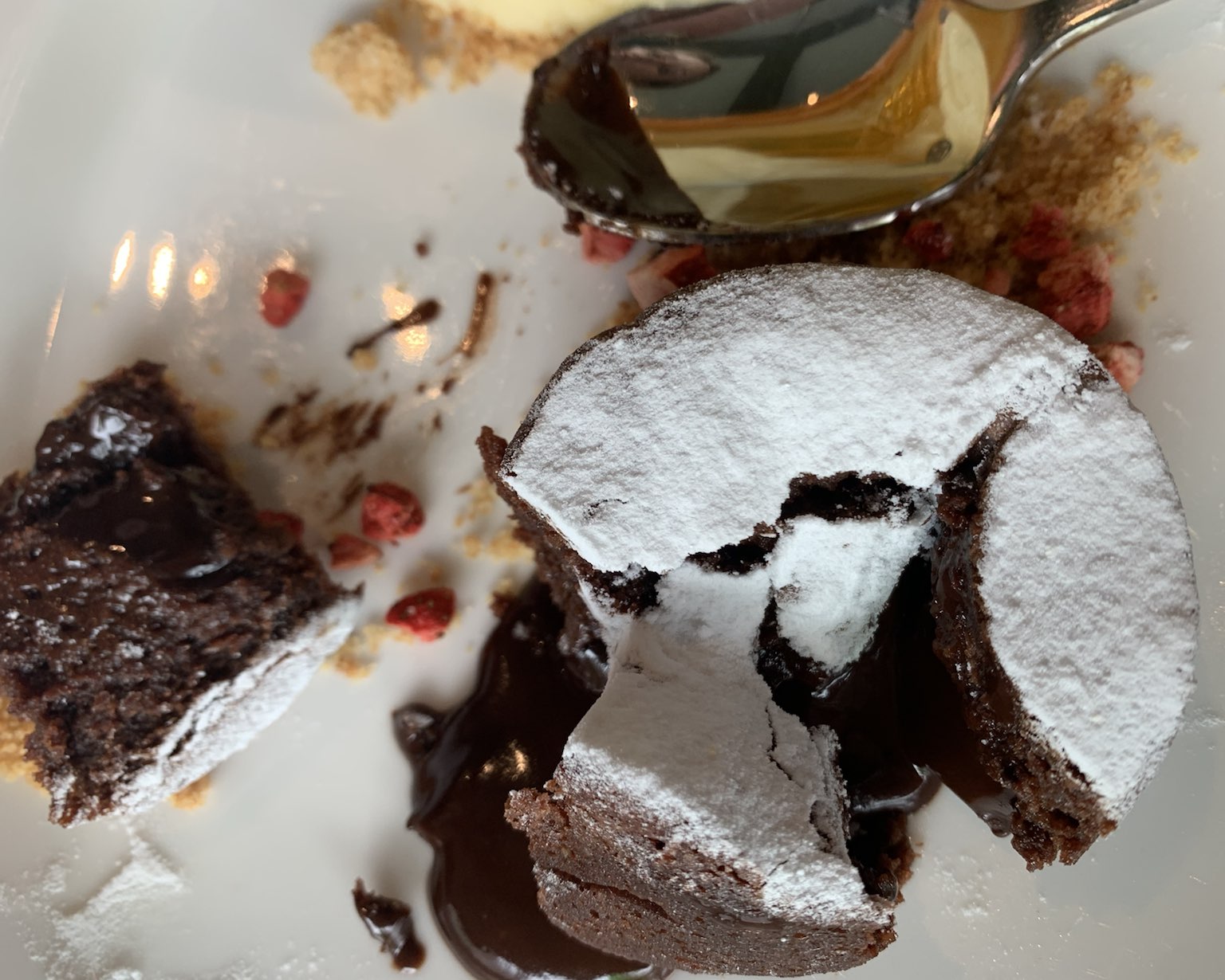 Next we proceeded toward Somió and had a couple more drinks at a small restaurant and split croquetas, which are date-sized fried balls of cheese and jamón, and a specialty of restaurants and bars in Asturias. At the Somió Park restaurant we shared an excellent fish plate (Lubina al horno con su ajada) and a pork plate (Paletilla de lechal a baja temperatura), along with Sidra, but the desert was the star, Coulant de chocolate (Peach ice cream is found under the orange wedge, and that is hot fudge chocolate inside the cake). See the before and after pictures below: