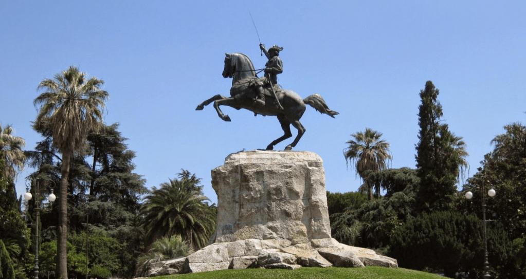 We also were among the many tourists with their pull suitcases, ill-suited for cobblestone streets, past stands selling warm foods and breads of all kinds, fresh fruits and vegetables, and through a well maintained park with gravel paths and, in the center, a larger than life statue of famed Italian Girabaldi on a horse.