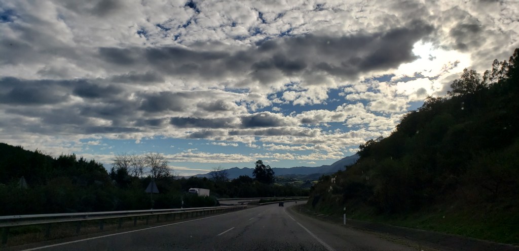 We awoke early and shortly arrived at the rental car office. After signing our lives away with the rental agreement (actually Jesse signed it all, since the rental is in her name due to the fact she can drive a manual car, and I cannot, and almost all the rental cars in Europe have a manual transmission), we proceeded to the cavernous underground parking lot. There we were met by a mechanic, who led us to the car, and walked off, back to working on other cars we assumed, and left in front of a small, grey, Peugot, with so much hail damage on the hood and roof, we could have thrown rocks at it and one wouldn’t notice. As there was no easy way to understand how to engage reverse, and wanting to get on the road, ahead of the late afternoon rain, I had Jesse put the car in neutral, I pushed it out of the parking spot, and she navigated the wheel to avoid the huge pylons painted in faded, now cracked, blue paint. We hit the road with the sun shining, and the beautiful drive through Asturias into Cantabria ahead of us.