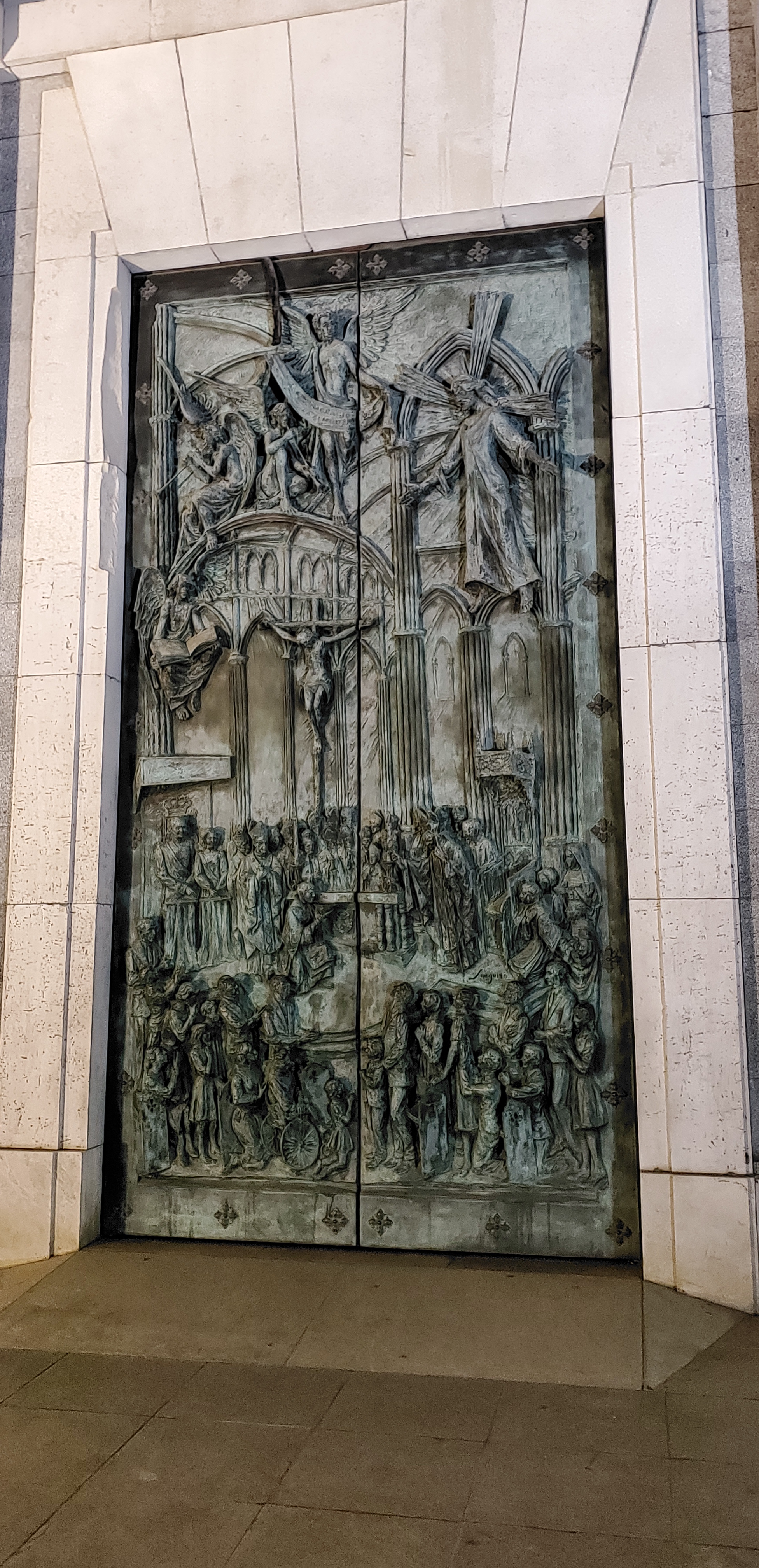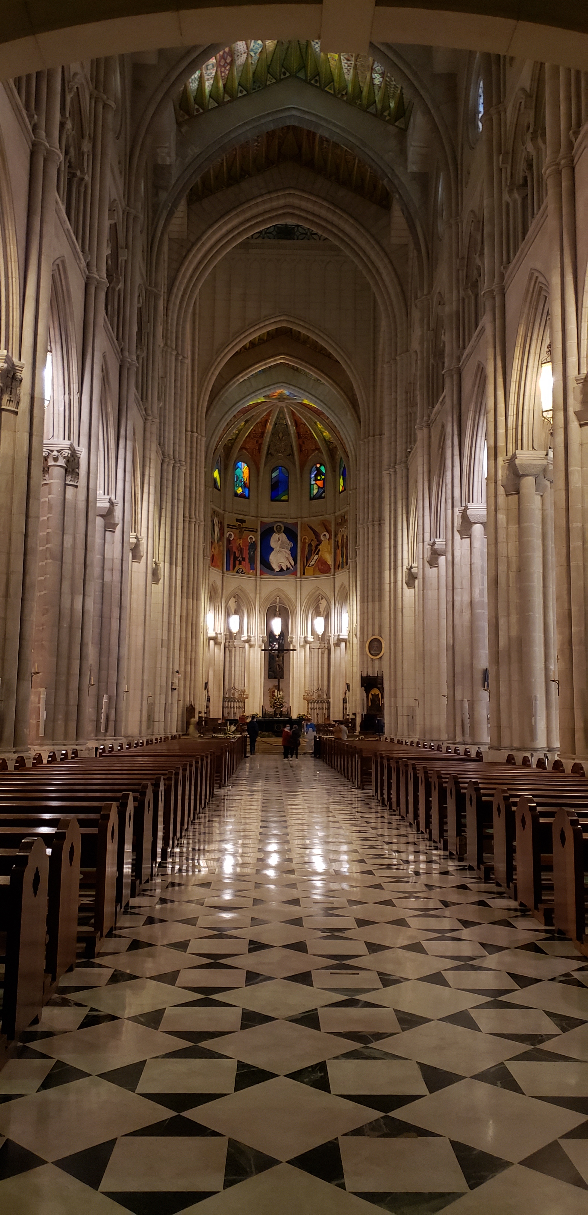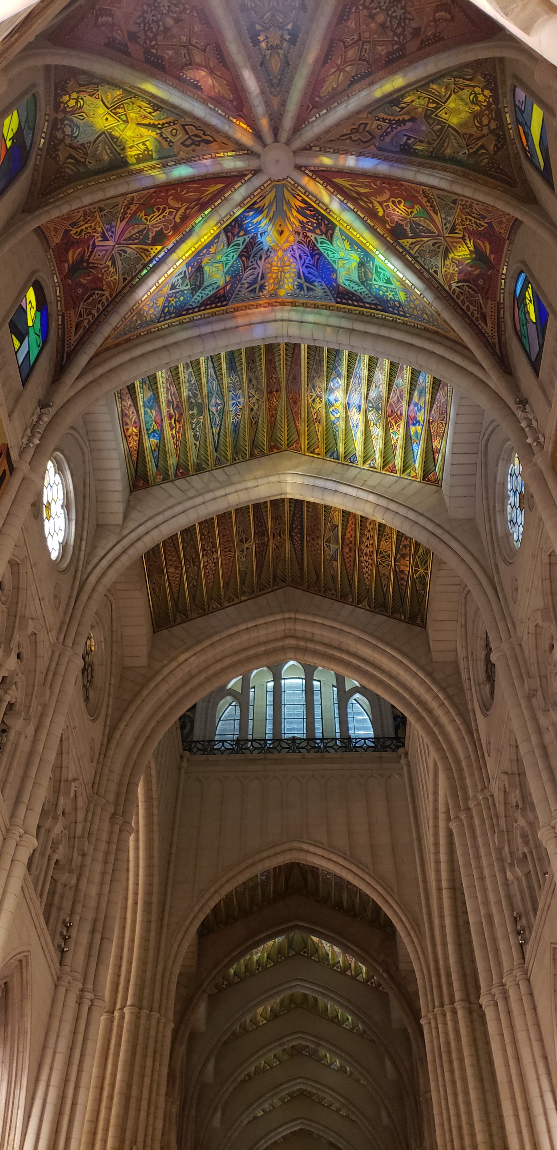 We slowly paced on the square that separated the two, before heading toward the entrance of the cathedral. It is not as ancient as many we have visited in Spain, with construction beginning in 1899 but not finishing until 1993. It has the typical gothic ceilings, but with added colors much more modern, and is lined with shrines to many lesser known saints, and one very bright and impressive one to the virgin Mary. A crypt also houses many saints, but it was closed on our visit.