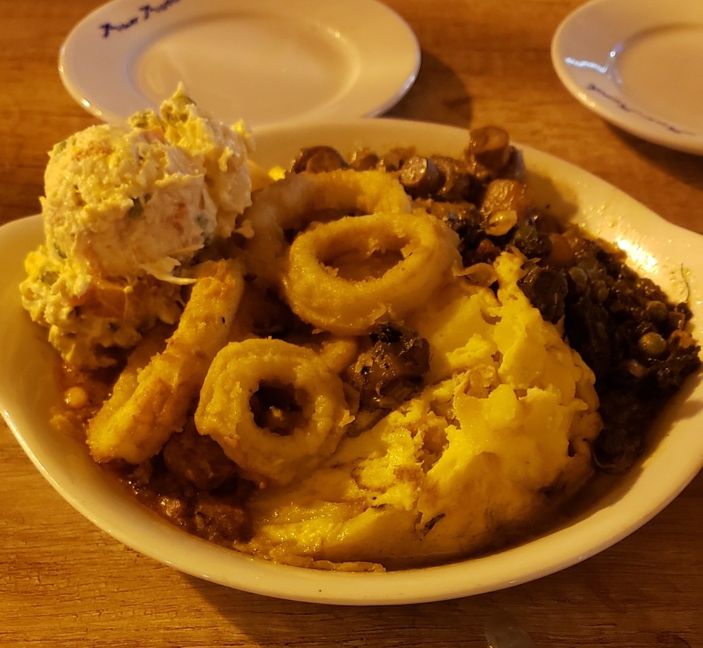 Upon arrival at 9pm we were hungry, though it being a Wednesday night in December, not many places were open, but after wandering the city for awhile, we found a place that served big beers and had a plate of mixed tapas, much of which we had tried before, but had never seen it piled high on one plate. It was truly impressive; toritlla, patatas fritas, calamari, ensalada rusia, albóndigas, and two new types of tapas, one a mushroom dish and the other a spice filled intestines and that was the star of the show; in a regular sized skillet plate.