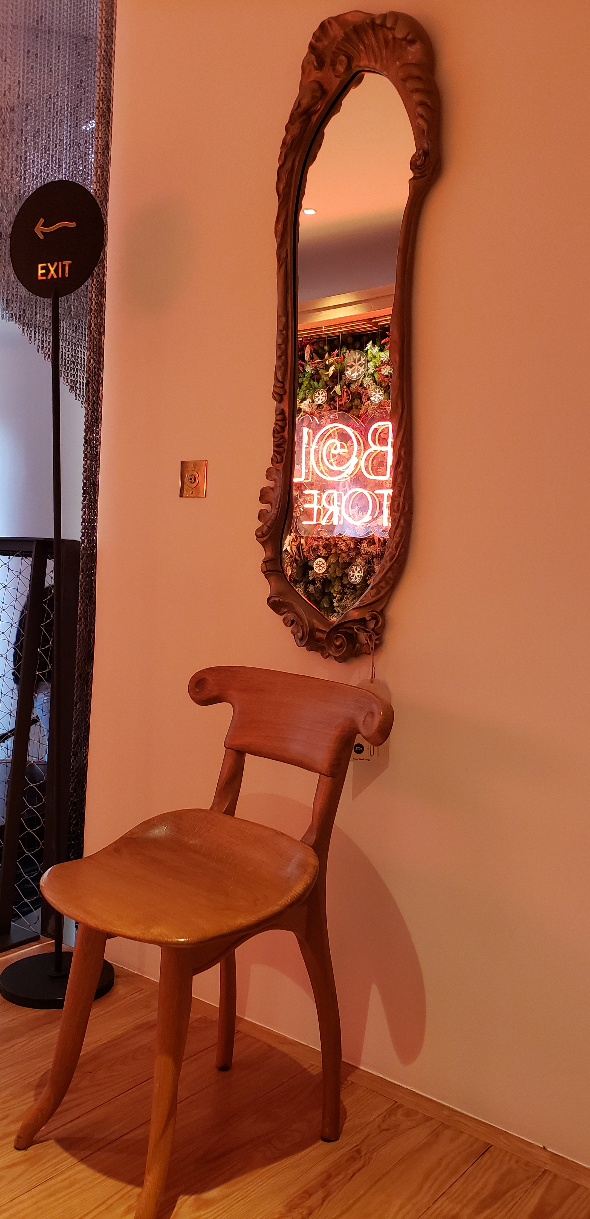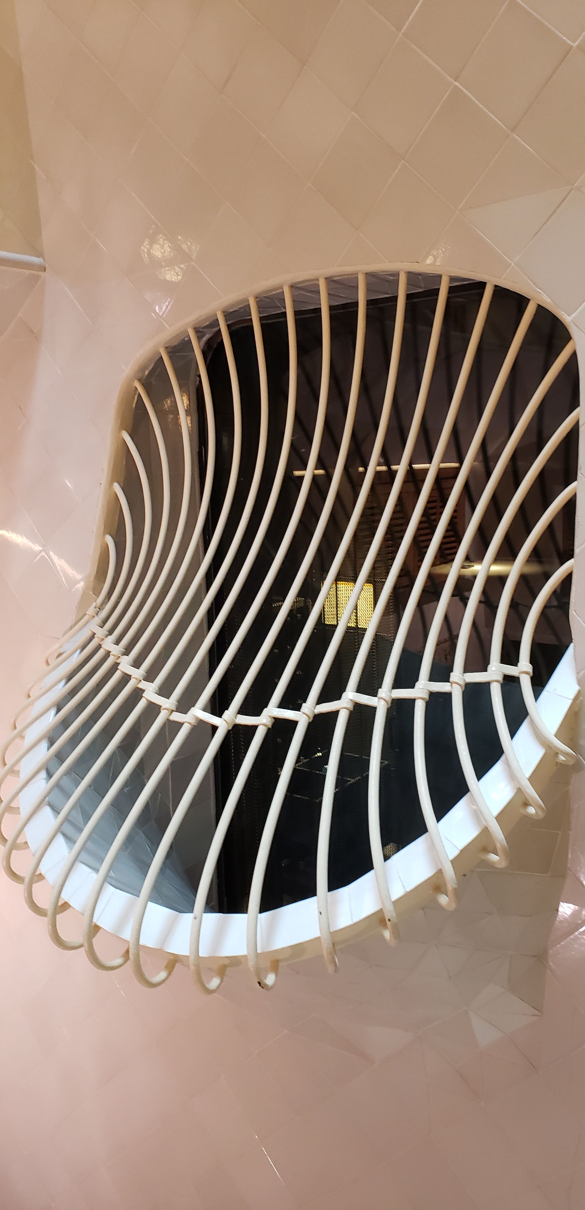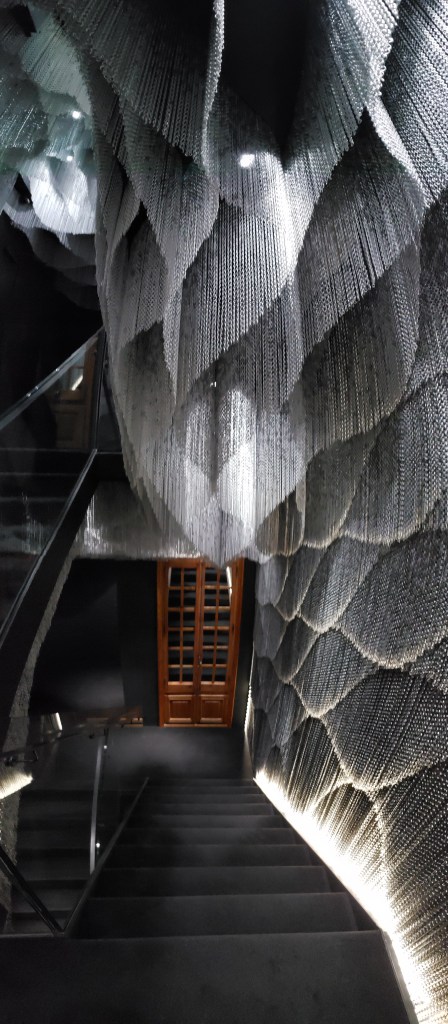 The trip back down, with the staircase all black and decorated with hanging small chains, that gave off an oceanic vibe.