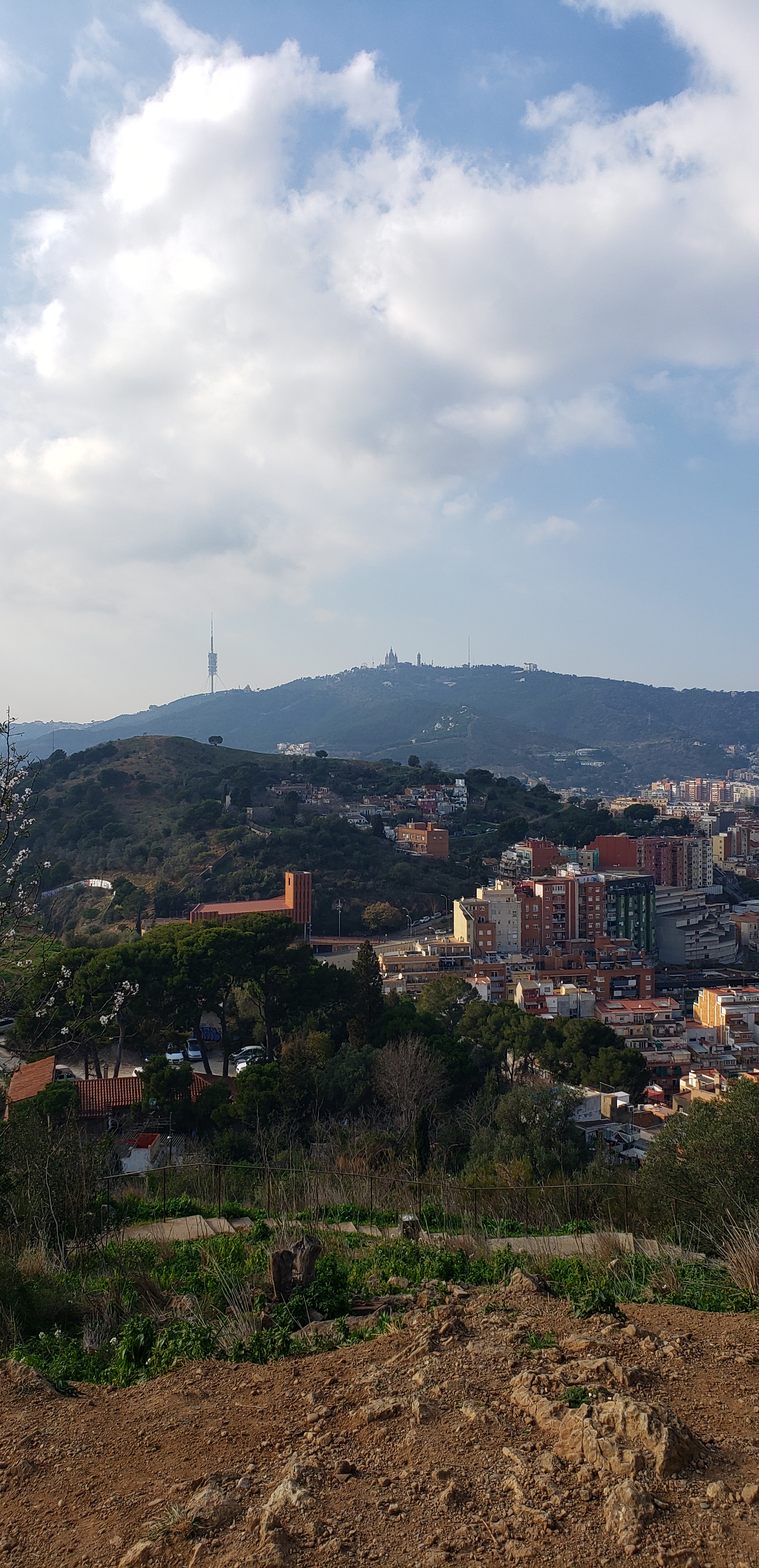Back on the streets of Barcelona, we looked at the map app for a place to go next. We had a friend tell us to visit the Gracia neighborhood in North Barcelona, near Gaudí’s Parc Guell. Our first destination was the Mirador de les Bateries, which was a cannon instillation set up high above the city during the Spanish Civil War to attack Fascist bombers. Before we arrived there, we stopped at the cafe on the way up and and ate some piemento del padrón, which are roasted and salted mild peppers and fried Bacalao balls, before trudging up the hill to the Mirador. More excellent city views awaited, and as we approached, we saw a flat boulder big enough for the two of us to sit, away from the people at the Mirador, so we took the opportunity to enjoy the spectacular city view in peace and quiet. It was hard to leave.