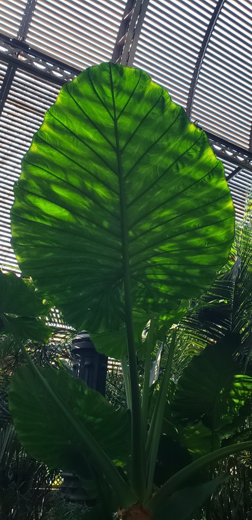 The sun was warm overhead as we found the nearest entrance to the massive city park. Our first stop was the atrium, which allowed light in through many thin wooden slats, and found it empty. We walked through the old building with a very tall ceiling, observing the lush green ferns, palm trees, and the largest elephant ear plants leaves ever.