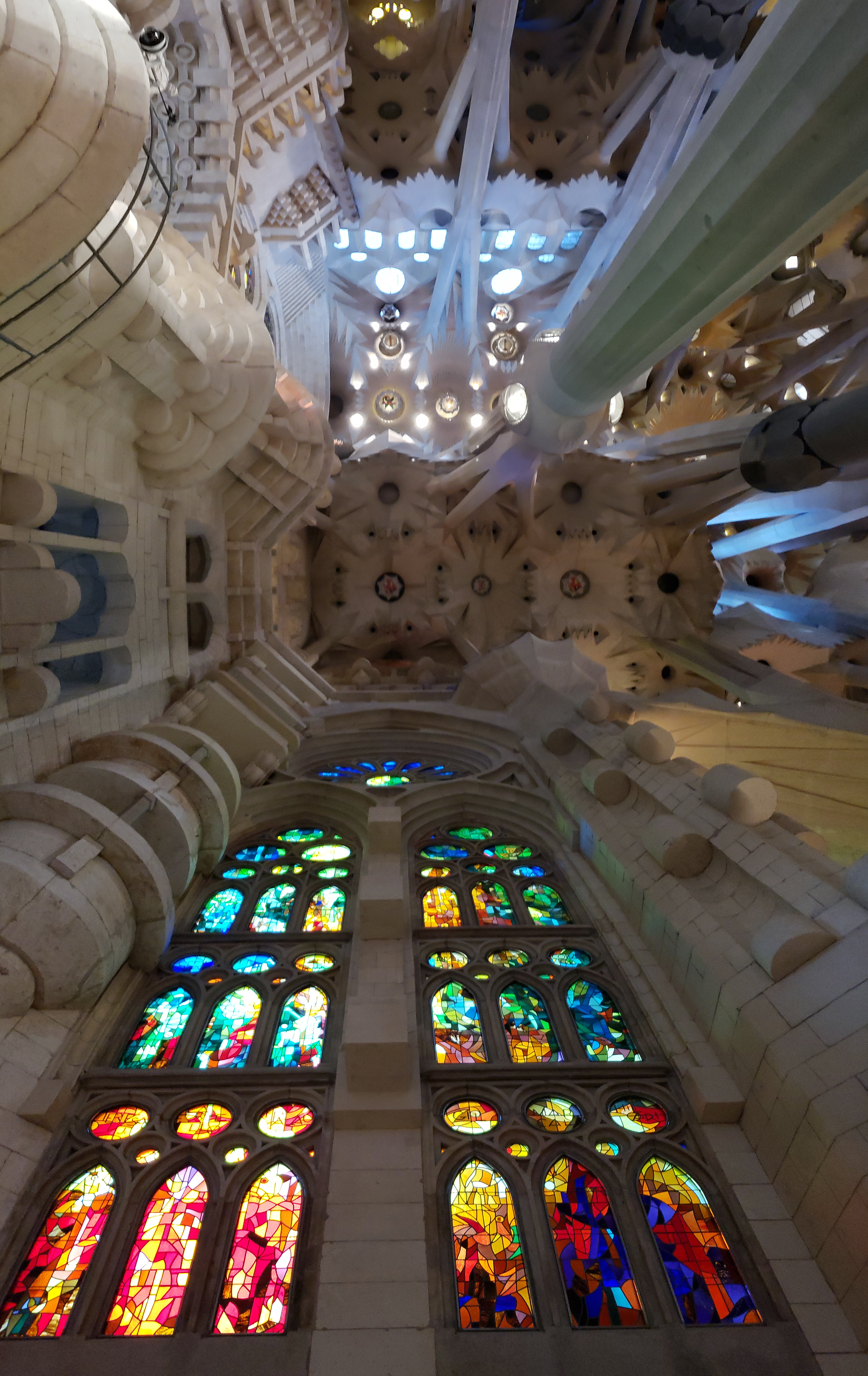 We walked underneath, our next spot some much needed lunch, before our tour of La Sagrada Familia. We arrived a bit after 4pm, with our tour to follow at 4:45pm. This gave us time to wander in the church, and, after passing through airport-like security, we stood in awe, looking up at it.