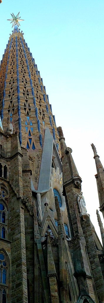 We joined the tour, led by an English-speaking native, as she described and told us the history and future of the church. As many may know, the church is still under construction, as it has been for almost 100 years, and will not be finished soon. Construction began in 1882. Gaudi died in 1926. Completion had been scheduled for the 100th anniversary of Gaudi’s death but covid has delayed completion for a date yet unknown. She pointed out the Virgin Mary tower, which was recently completed in December 2021.