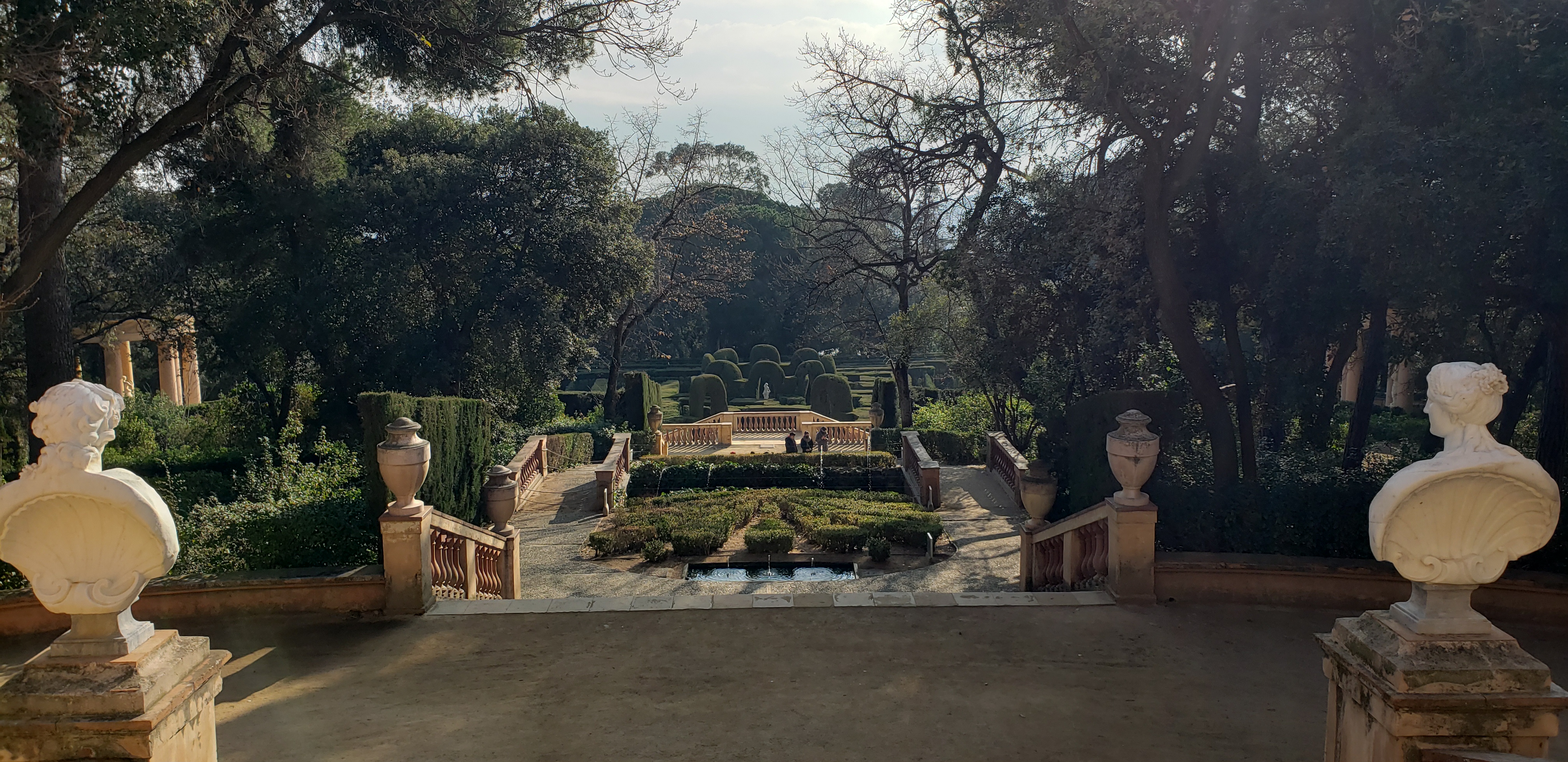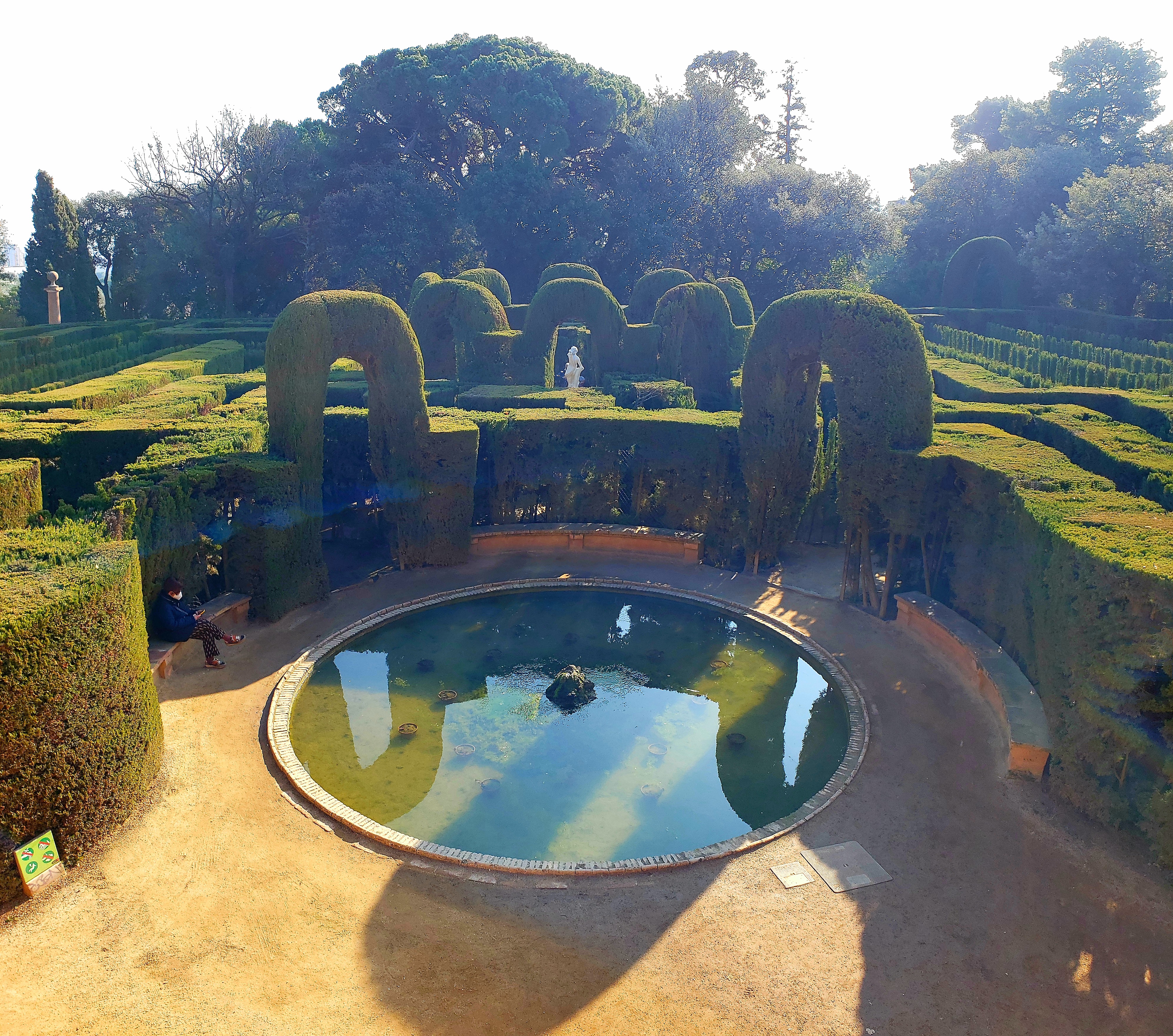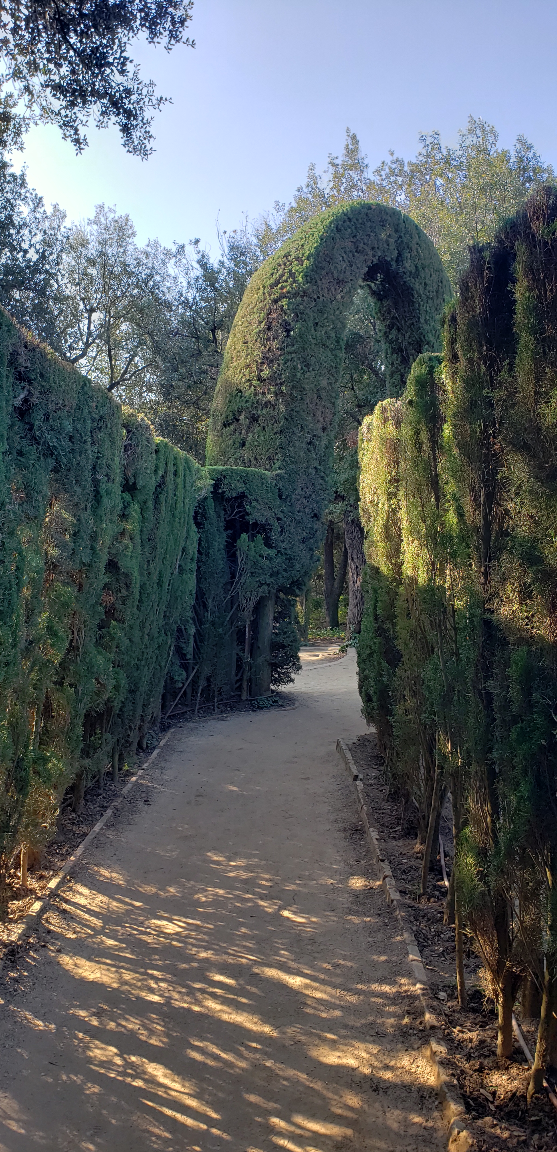 We began the day taking the subway for the first time, to the neighborhoods of Horta and La Vall D’Hebron. Our destination this brisk, early morning was Laberint d’Horta, or The Labyrinth of Horta. For a reasonable 2.33 Euro per person, we could explore the centuries old garden as well as the full size labyrinth at its center. As we entered each path we were on split, and split again, taking us past old statues and busts, eventually arriving at the main structure, a closed off building built in 1802, with two wide staircases leading up to it, with a large statue on top flanked by grand urns. Behind the building was a square pond, behind that, was a smaller pond encircled by rocks with a statue of a reclining nymph that lazily watched all (the image at the beginning of this post is from the nymph’s perceptive).