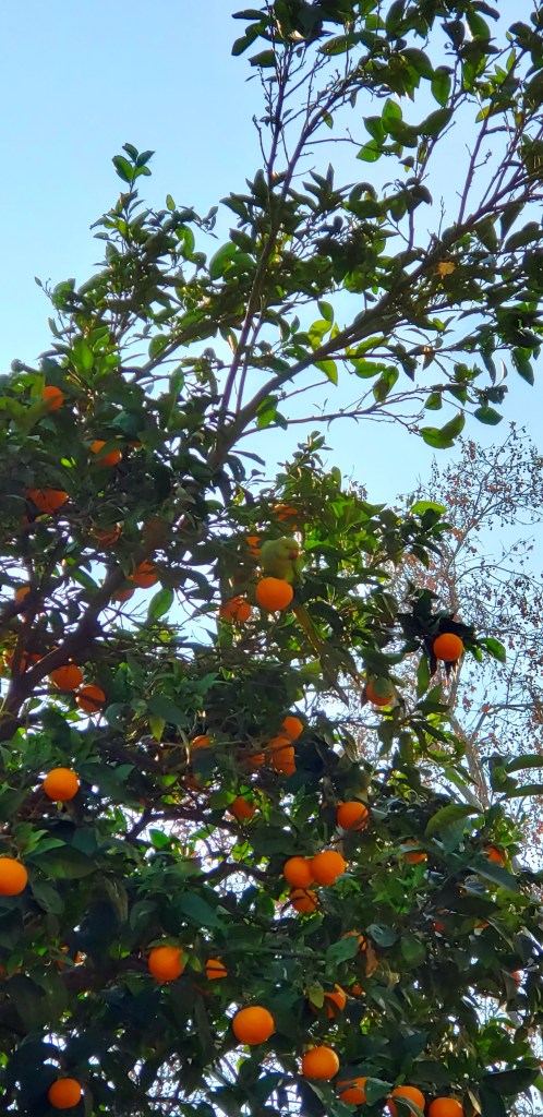 We continued our walk through the park, and heard the familiar sound of parrots, nested high above us. In Long Beach there are a flock of parrots that will travel around the city, and we used to see them outside our balcony at least once a year, so we knew the sound. We squinted our eyes to see them, and then found a few eating tangerines in a tree nearby.