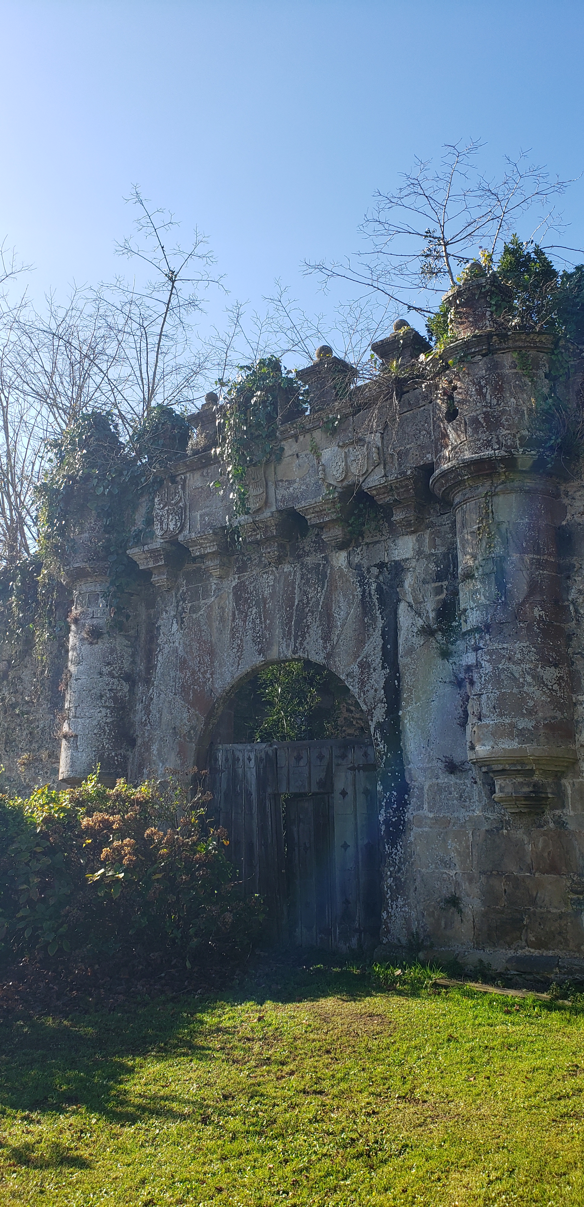 We boarded the train at 10:30am, and took the 1.5 hour trip through Asturias, passing many towns, the ocean, green hills, until finally reaching the town of Muros de Nalón. We walked toward the center of town, passing a dilapidated yet still standing shell of a former fortification, known as the Palacio de Valdercarzana y Vallehermoso. We peaked through the locked gate and noted the overgrown greenery, as well as the opposite wall crest (see below) and one could imagine a medieval bustling market inside.