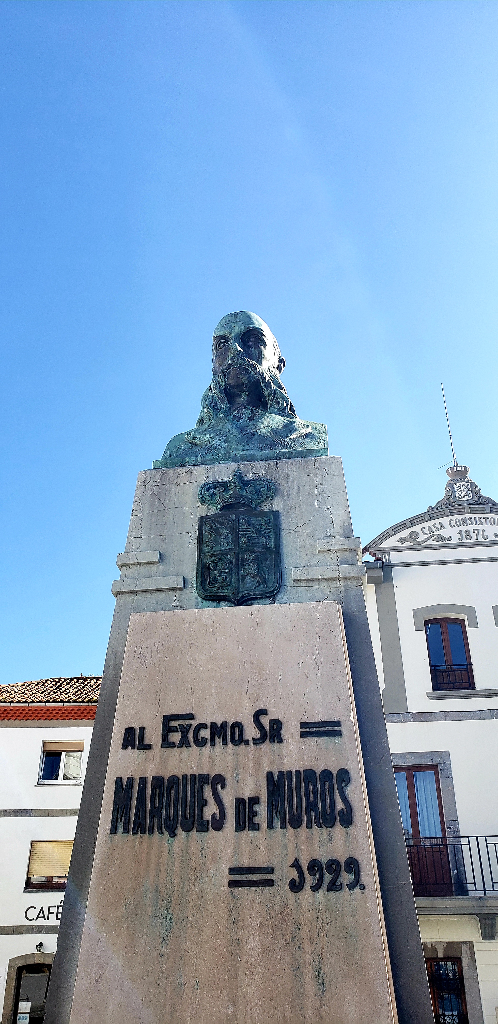 The park that surrounding the Palacio was well maintained and we took a red brick road into the center of town, stopping to have a coffee at a cafe on the Plaza Marqués de Muros, named for the Marqués, who has a statue on the square, in which he sports quite the impressive mustache. There were people sitting at cafes while others going about their daily routines, and we were happy to join them. At one end of the square is the Iglesia de Santa María, which was closed during our visit, but still impressive in the sunlight.