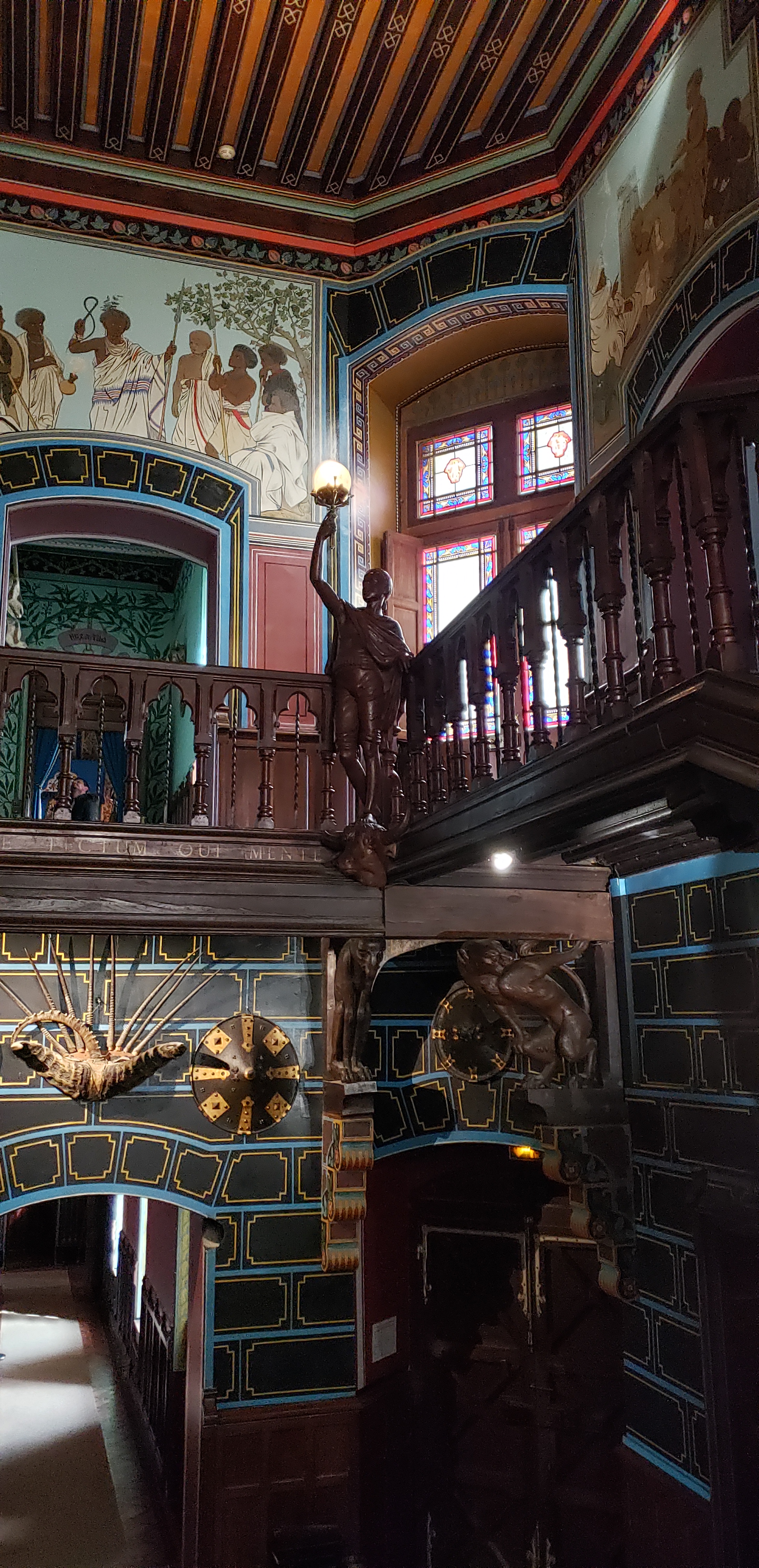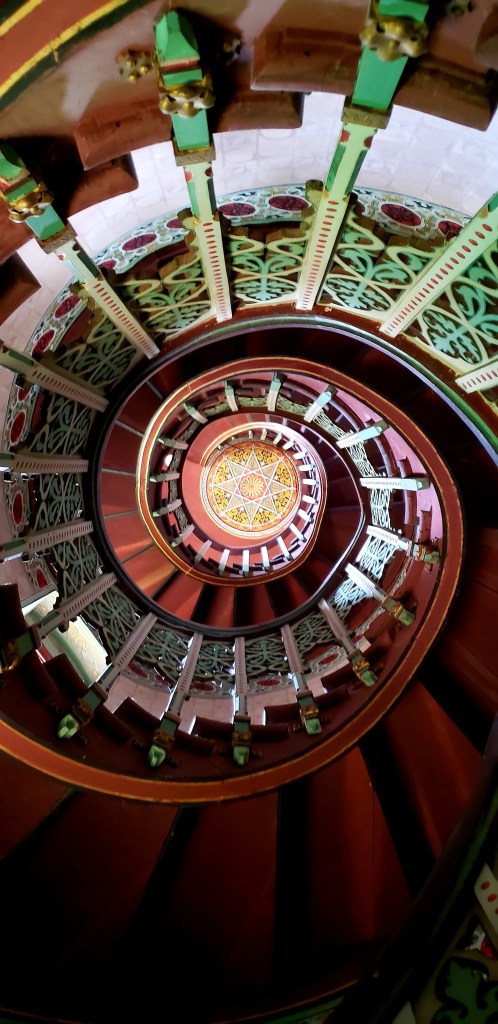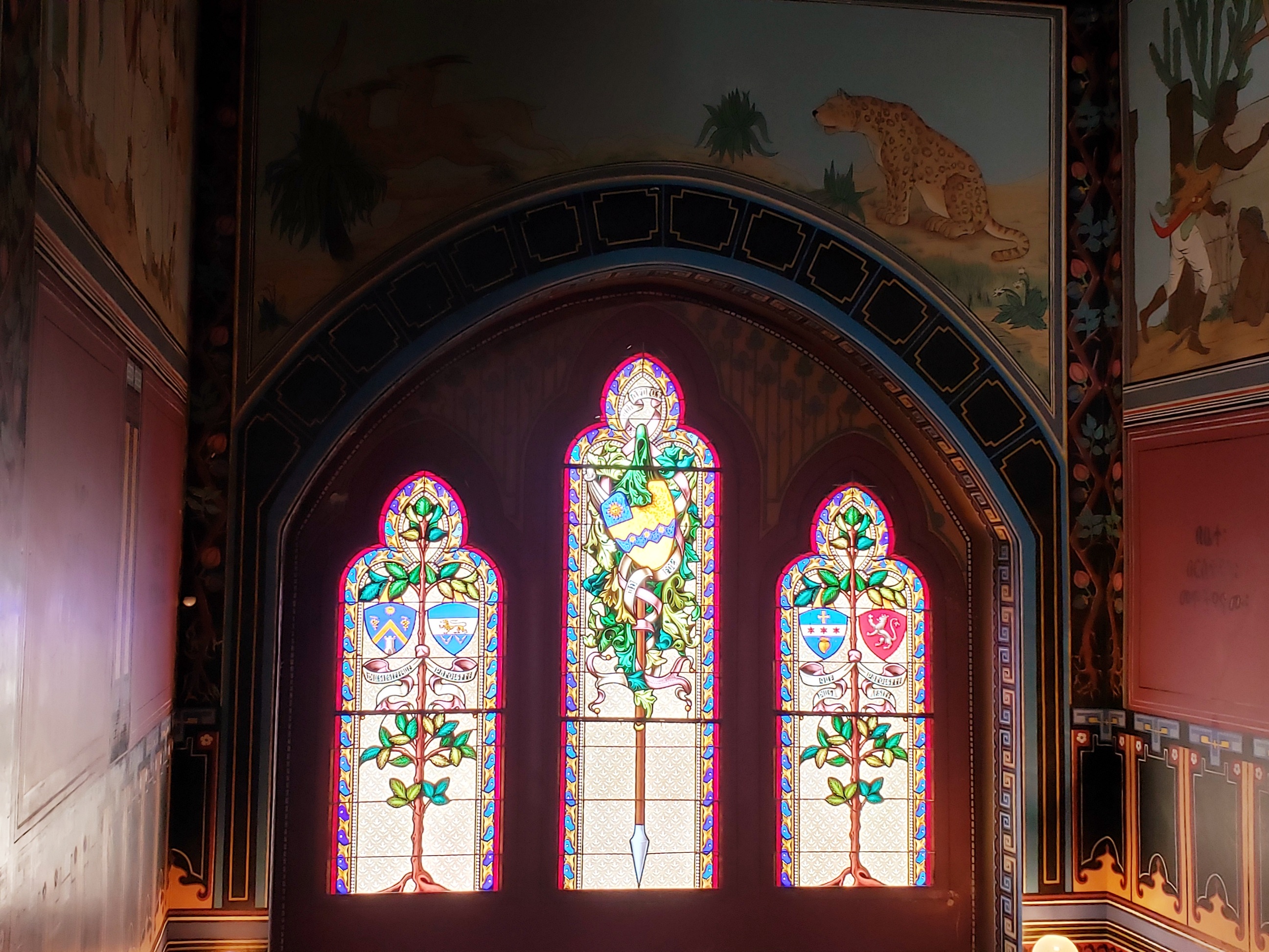 We walked the grounds as we waited for the tour of the inside of the home, and once the tour guide was ready, he led us inside, with a dozen or so fellow visitors. We did not know the tour would be completely in French, which was quite difficult for us as none of us speak or understand French. They did provide printed guides in both Spanish and English, which helped immensely. The entryway was done in dark woods, with a staircase to the second level, paintings made from d’Abbadie’s time mapping Ethopia, and three stained glass windows as well. The house was designed by blending Neo-Gothic with Orietalism, and it was truly a unique home.