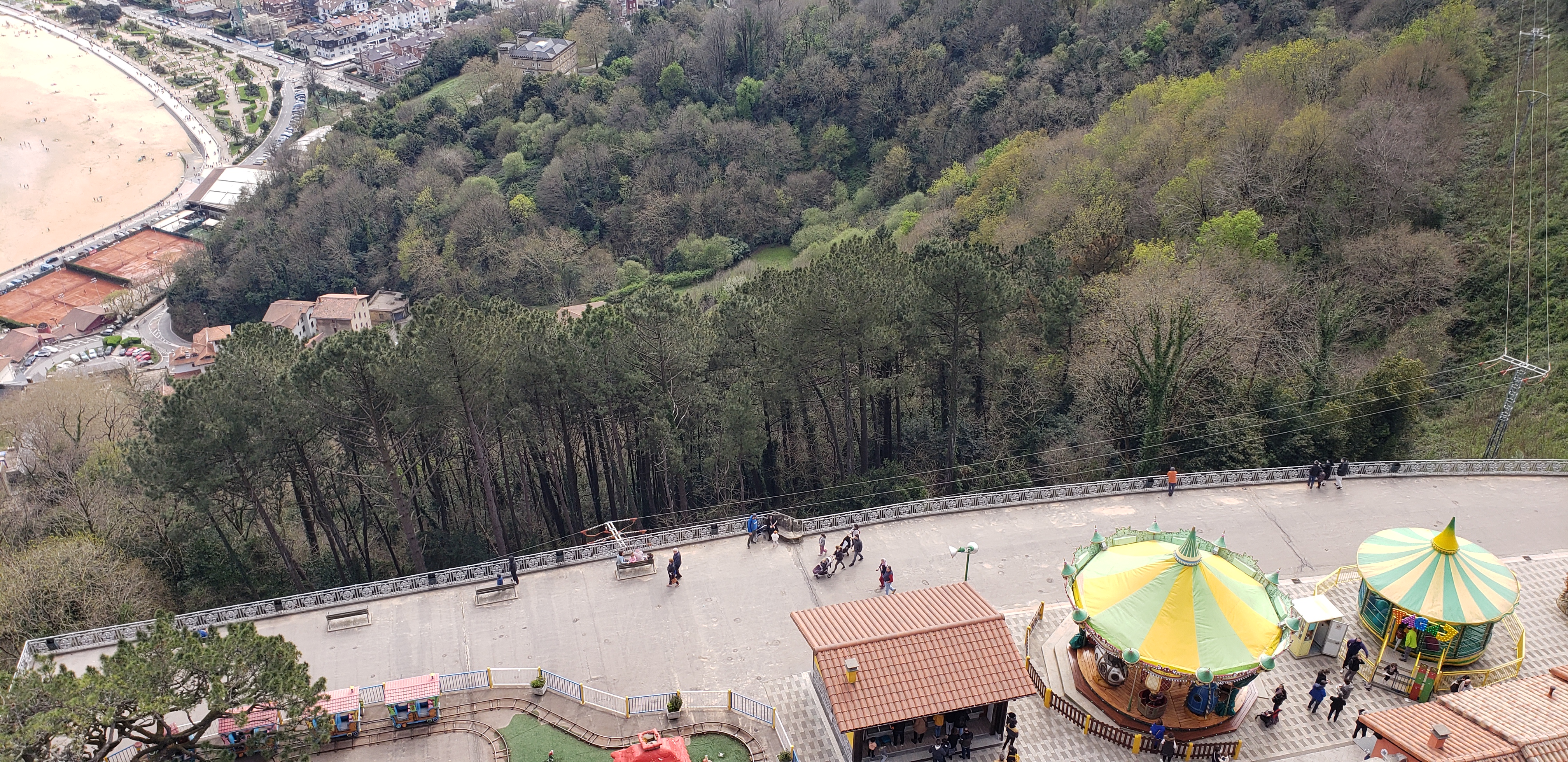 We walked past the end of the beach, where there is a funicular that takes one up to Monte Igueldo, that provides the famous views of the city and beach below, seen in so many postcards. Once we exited the funicular, there was a lookout point, so everyone took out their phones to take the picture. Then, we all proceeded up a small set of stairs to another lookout point, and then another, where the park opened up to large platforms facing the city and countryside and small mountains in the background.