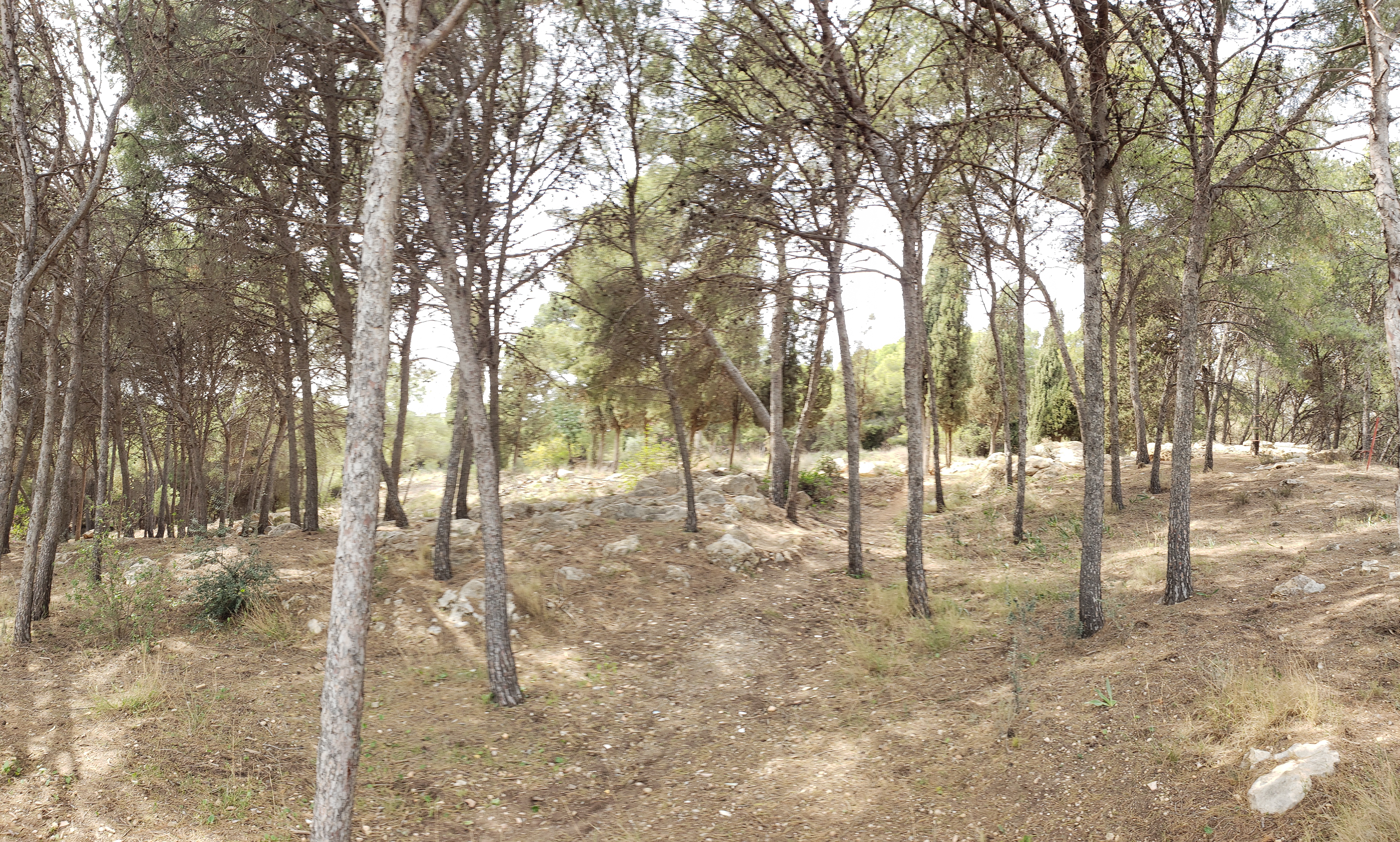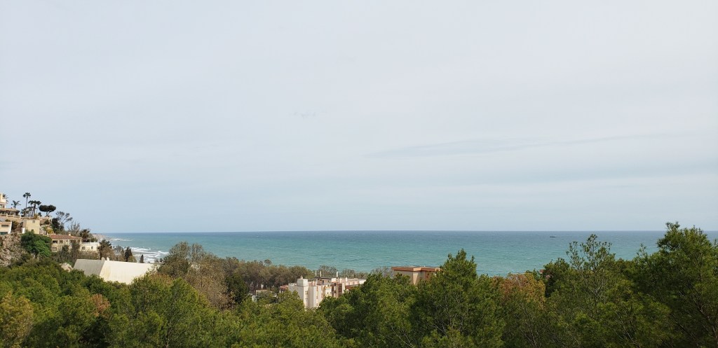 Anyway, we traveled through the park, which had an asphalt path but it was also easy to veer into the forest, which was populated with many pine trees and pine needles replaced grass and other shrubs, making it easier to traverse the off road terrain. We found the mirador, which had a bench we could rest our weary feet and look out, above the tall trees, with envy at the nearby homes that were able to enjoy this sea view from their balconies.