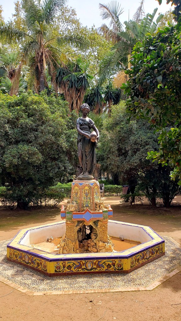 Our next excursion was a walk down to the beach; on the way we passed through the Parque de Málaga, which was like a little jungle oasis between the city and the ocean. Trees from all over the world, including numerous tall palm trees, eucalyptus, and furry pine trees, among many others, combined with gravel paths and grand tile and stone fountains with statues of nymphs at their center made the park feel serene and much quieter than the hustle and bustle of the Old Town that we had just left minutes earlier.