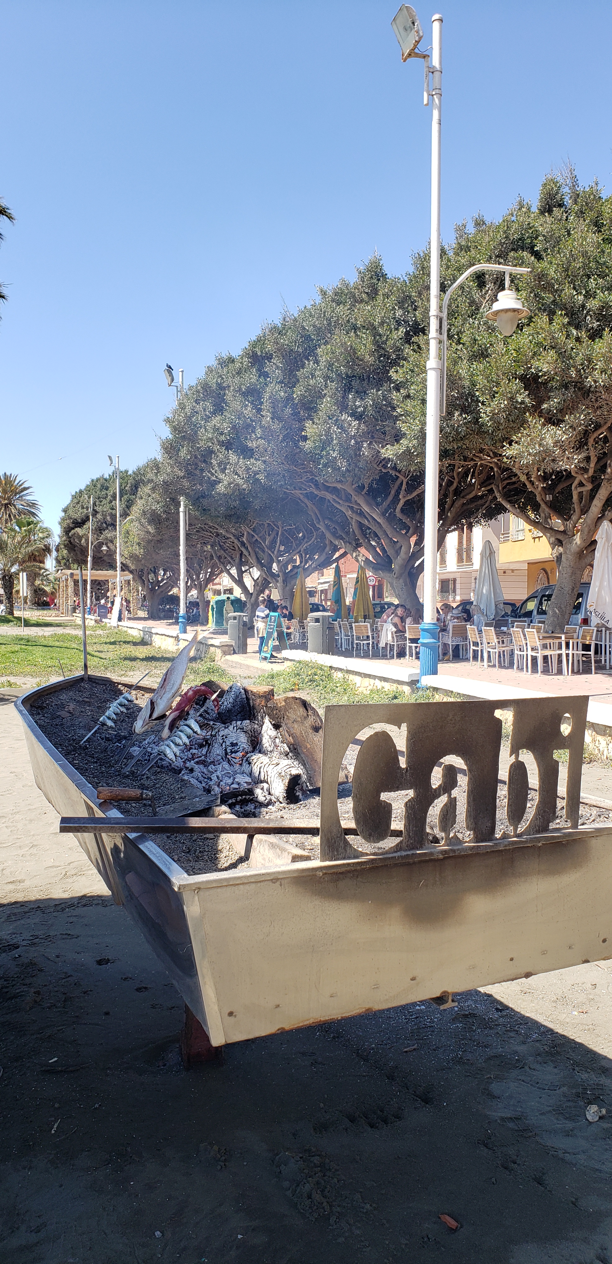 She also had made us reservations at one of the Chiringuitos (beach restaurant) that populate the coast in Málaga, recommended by our apartment hostess, named Restaurante Gabi. We walked from our rental apartment about an hour and a half along the beach front, enjoying the sun shining overhead and the cool breeze to maintain near perfect walking conditions. With the Mediterranean Sea as our backdrop, we ate a whole fresh fish (seabring) cooked on a nearby beach grill (our fish is the big white one!). The grill made of an old metal boat (like many of the Chiringitos here), shared fresh prawns and a salad along with a bottle of vino rosado. It was a great birthday meal!