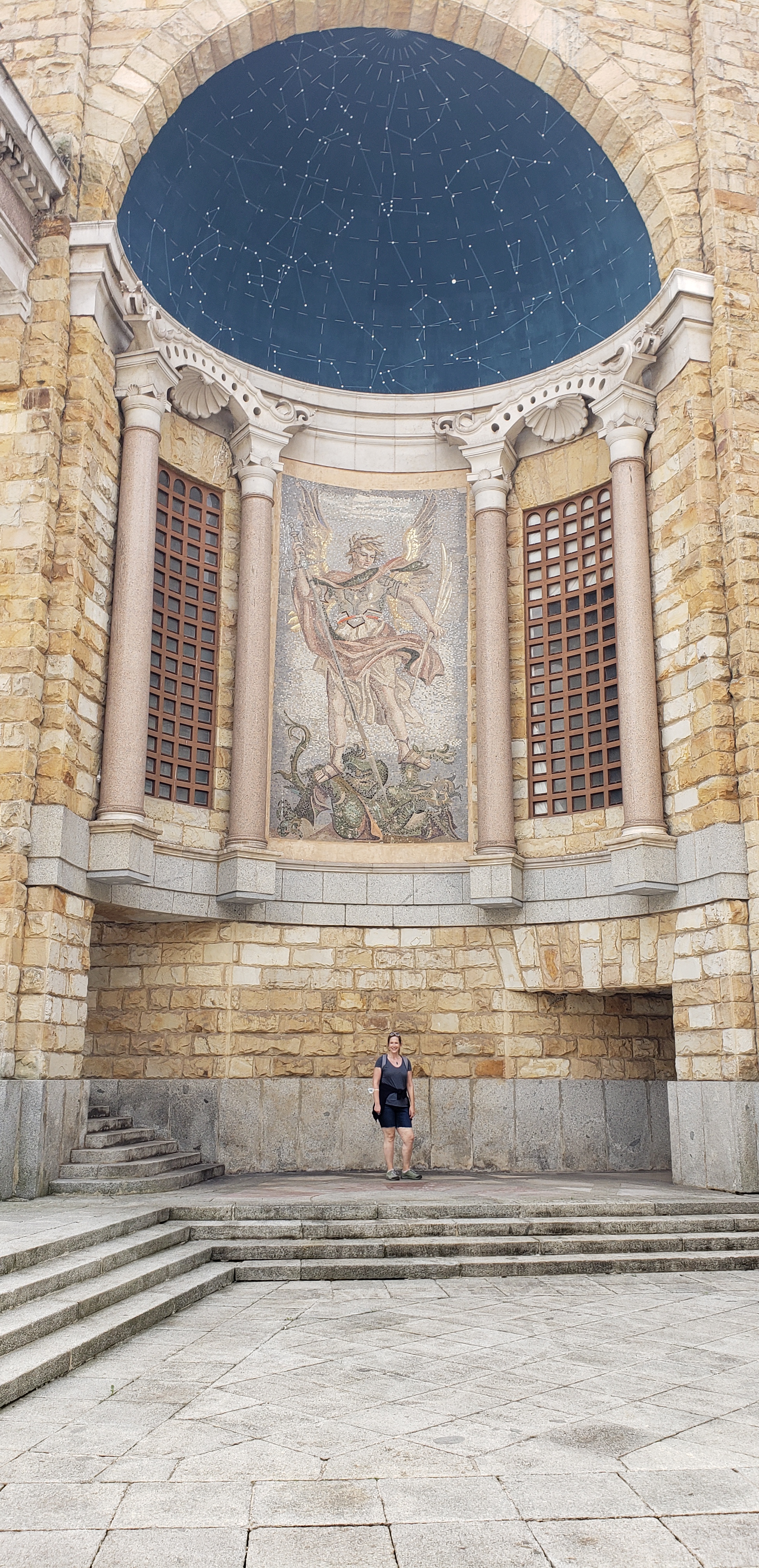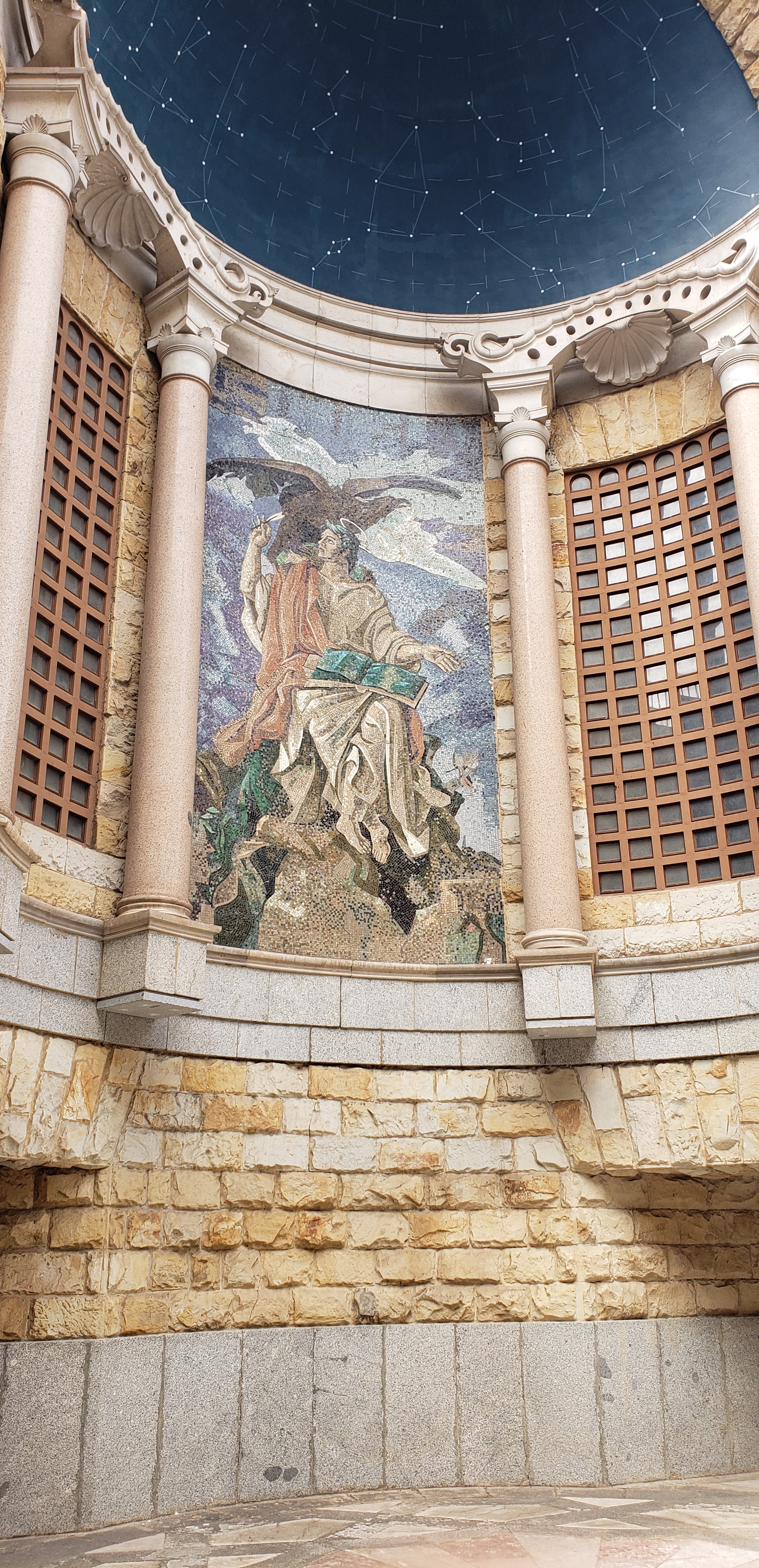 The courtyard above is populated with statues of scientists and philosophers; while the church has intricate tile mosaics situated inside the half domes. There are also iblical figure statues, just sitting on the steps in one corner of the huge courtyard, watching the students on their way to class, or tour groups listening to their guide or other visitors wandering around aimlessly. Their eyes (like ours) seeming to take in all around them. One can tour the tower, but we could not as it was closed due to Covid when we wanted to visit.