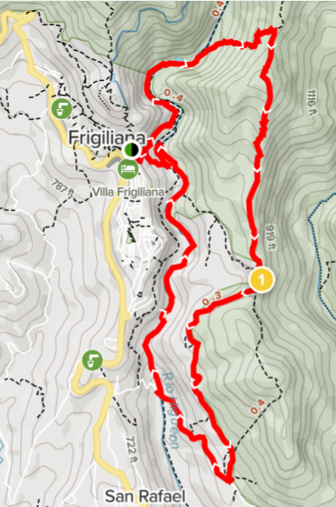Yesterday, we walked from the dry river bed below up 1300+ feet to the top of the second nearest mountain, see below where we were:
