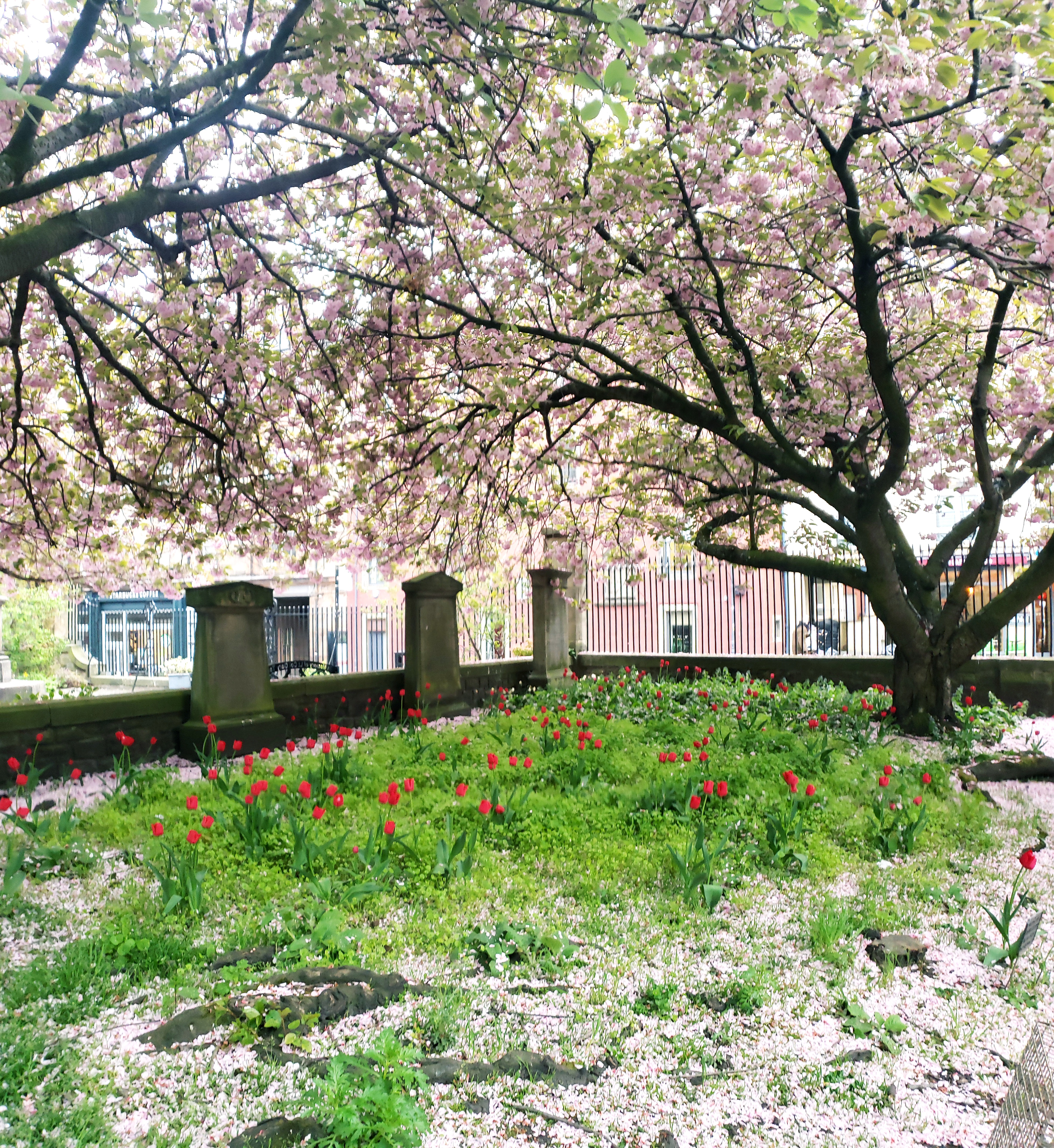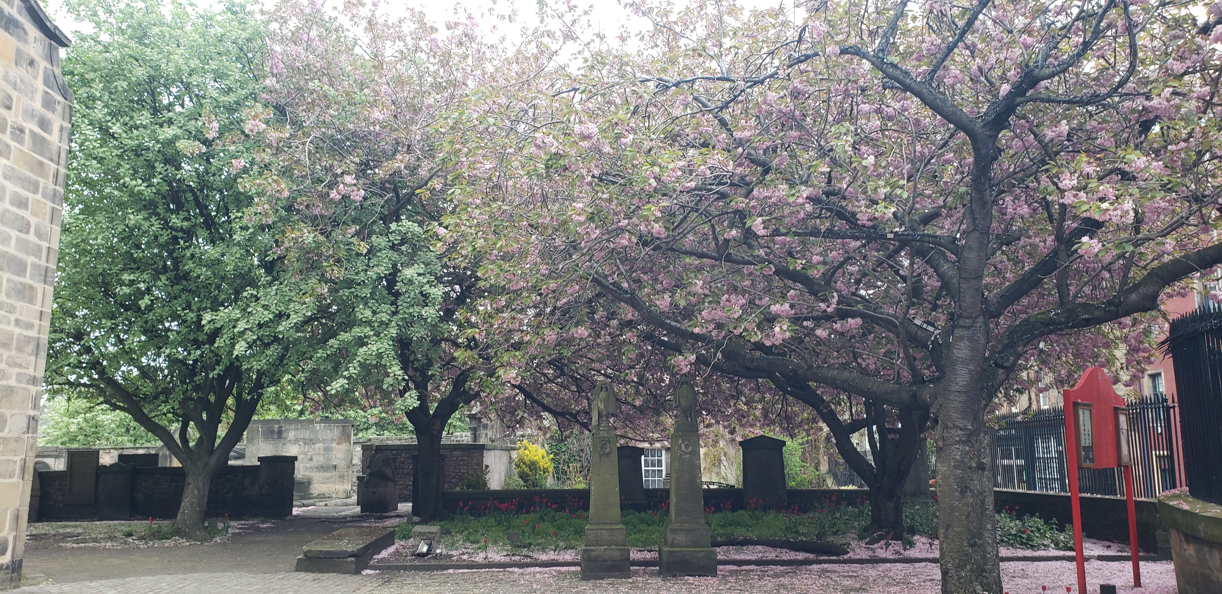 On our walk from our apartment to the Royal Mile we passed by the Canongate Kirk, which is a 17th century chapel and cemetery. While the chapel was closed, and the cemetery has seen better days, it was still calming to stroll through and see the hundreds’ year old tombstones, and the tiny pink leaves everywhere that looked like snow.