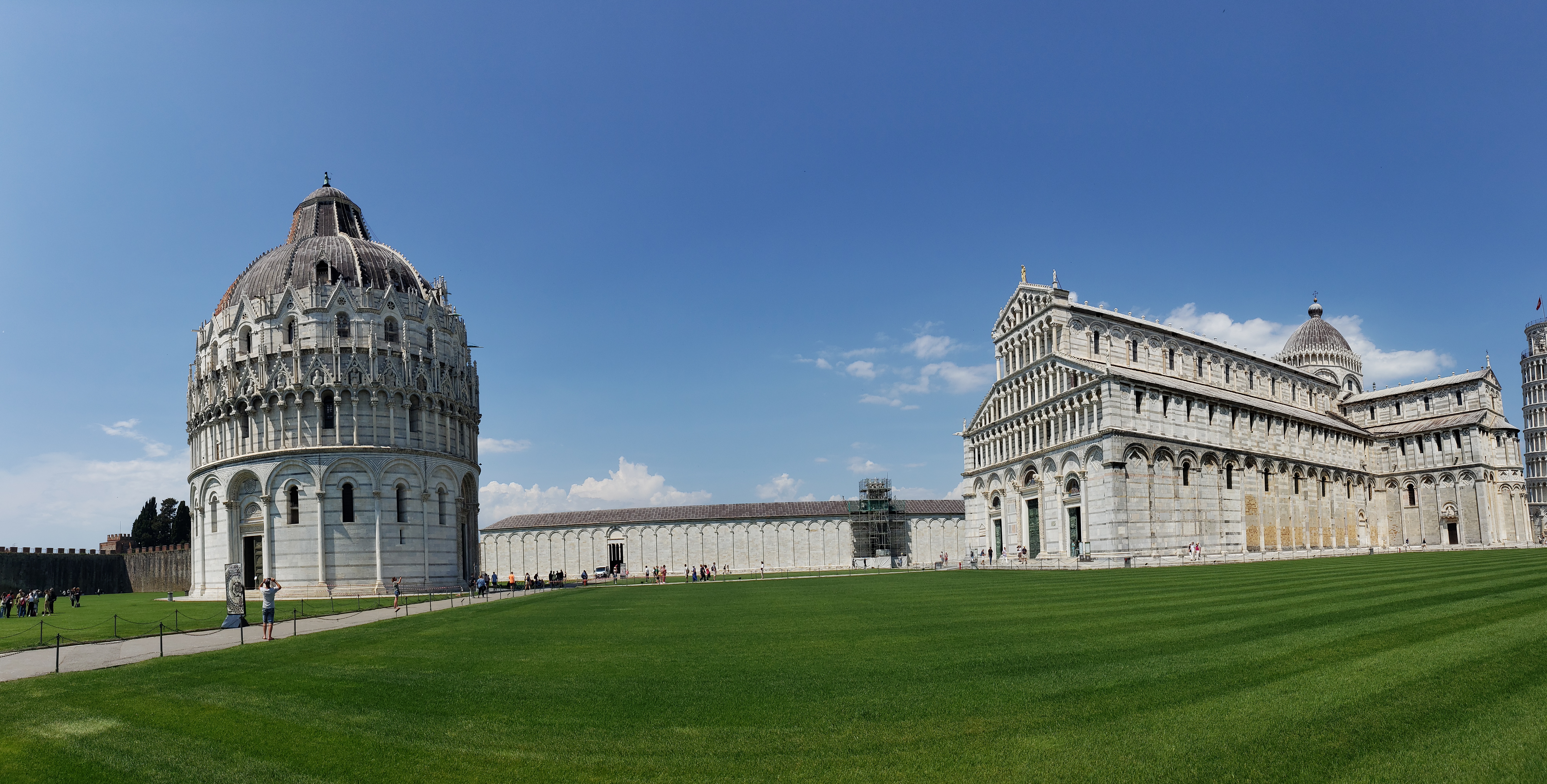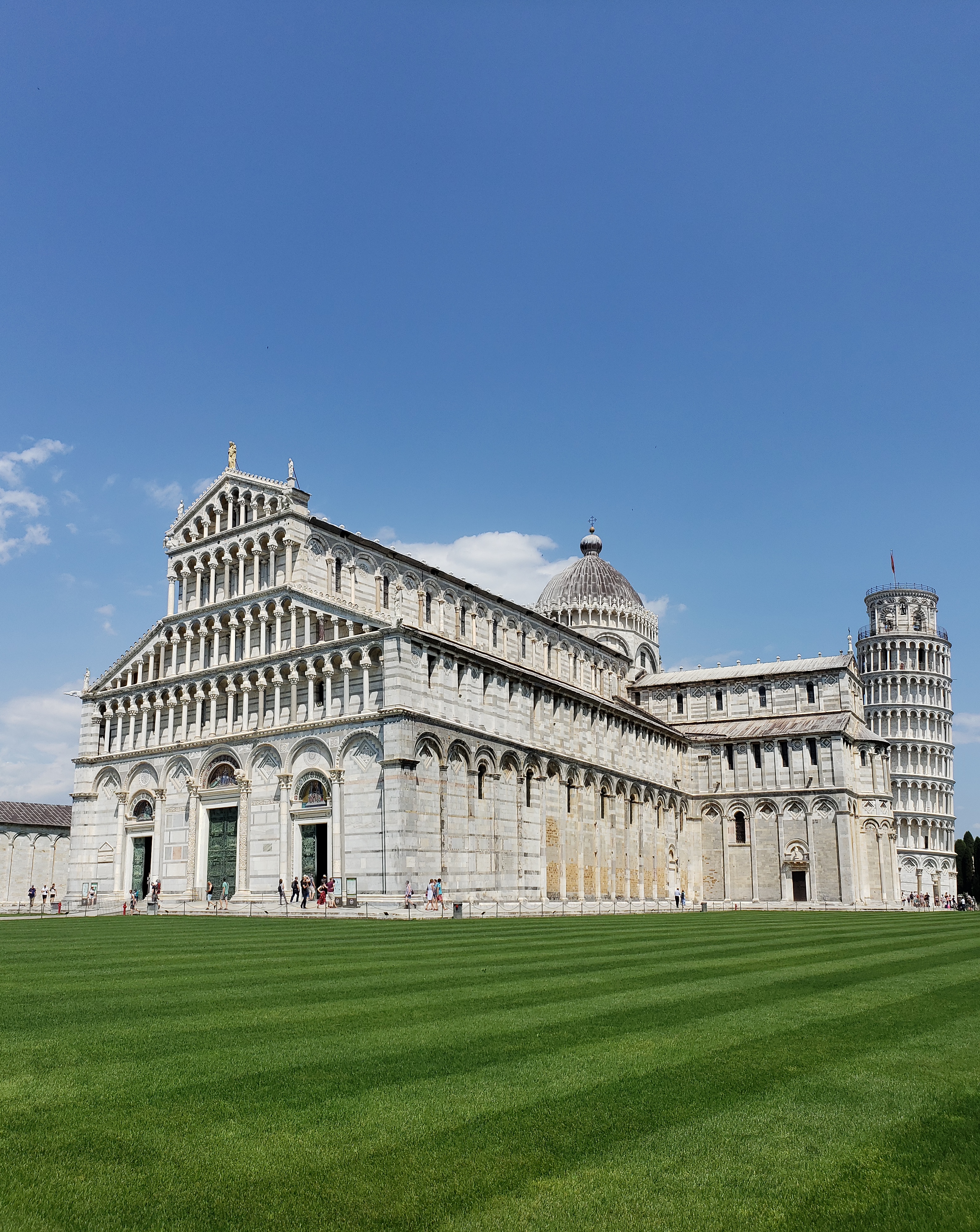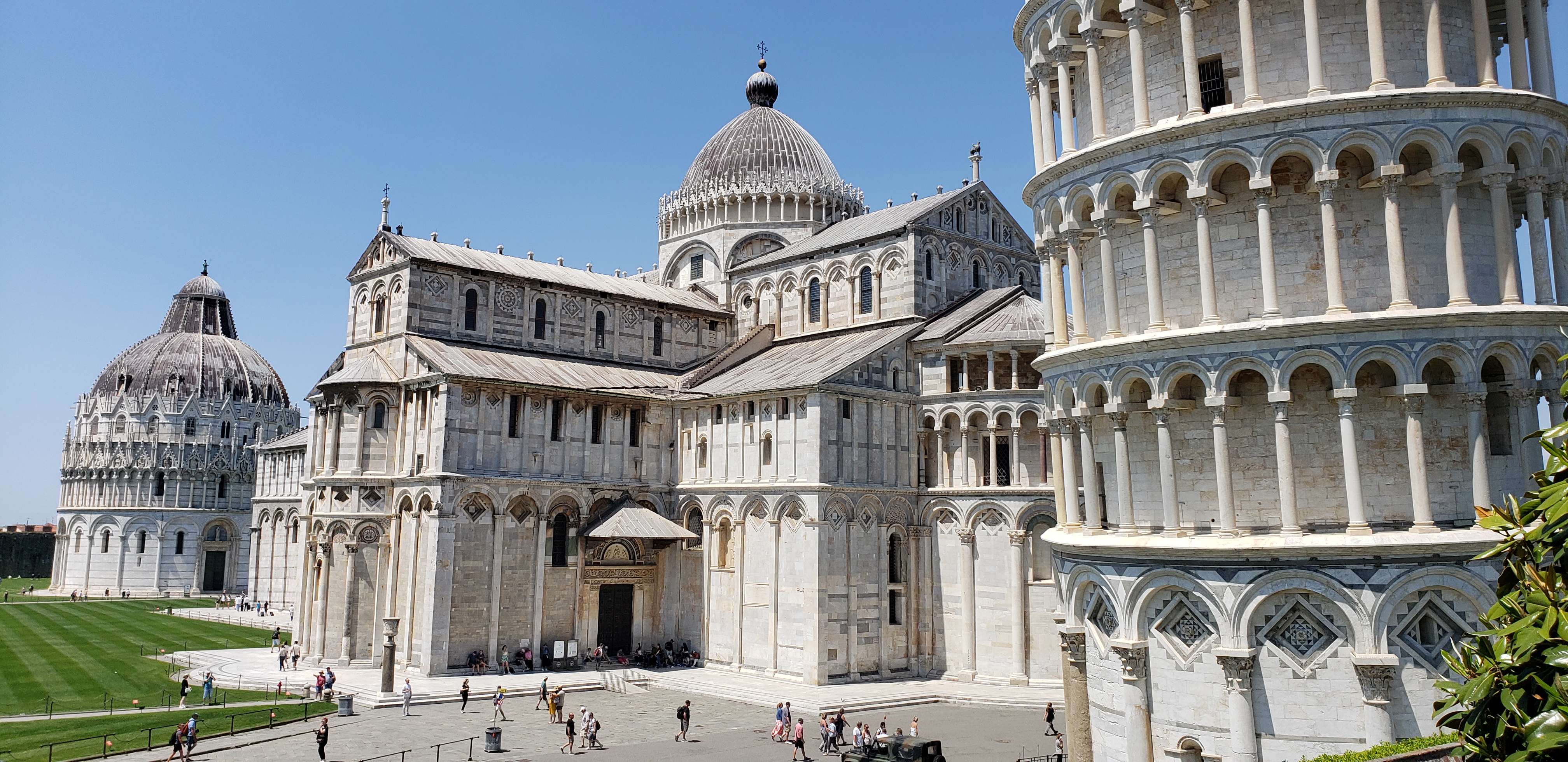 As we got closer, we took note of the Cathedral and the Baptistry behind it, which we were not aware existed as all we knew (and many people do) was the tower. We took pictures and went looking for a restroom so we stopped in the Pisa Panoramic Cafe, which is highly recommended. We had our first iced coffee in the past year and ate some excellent lunch with the leaning Tower of Pisa in the background! It was unbelievable to be there. Check out the view below!