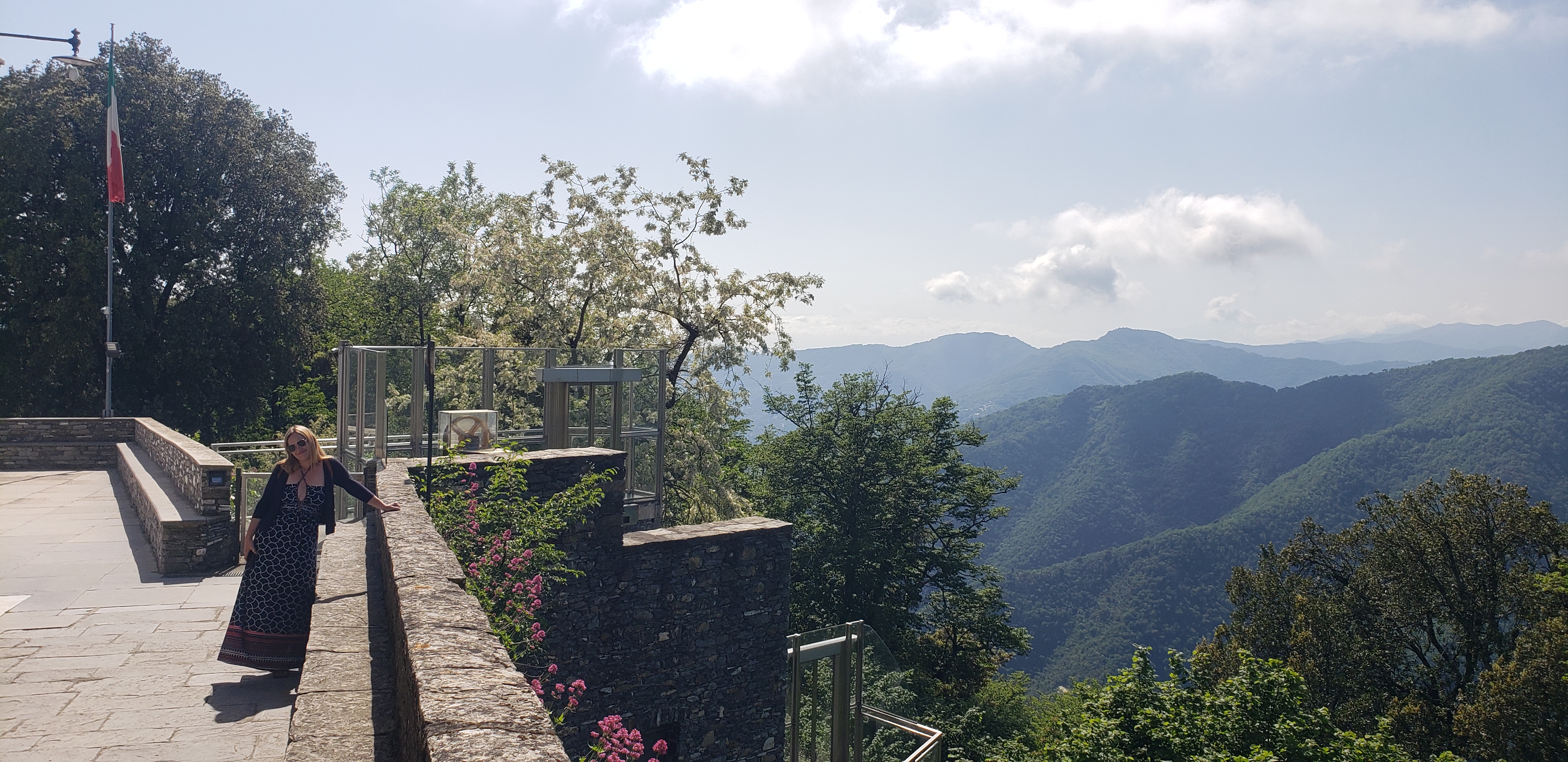 Admittedly, we did not have enough time to research Rapallo to the fullest, but we were mostly visiting to relax. However, Mom purchased some postcards, and I saw a cable car on one; when looking at the map app, I saw a marker for the Rapallo Cable Car, and we planned to go. We arrived a little after noon; the young man running the Cable car was named Matteo, and the three of us, along with a German tourist, all took the cable up…and up…and up. It was so high high up our ears popped and after passing over many fine looking homes with impressive pools (“where the poor people lived,” Matteo joked) we passed over the forest. Finally we arrived at the top of the mountain, where there was a small cafe. We passed the cafe, and walked up the path on our way to the Sanctuary of Our Lady of Montallegro.