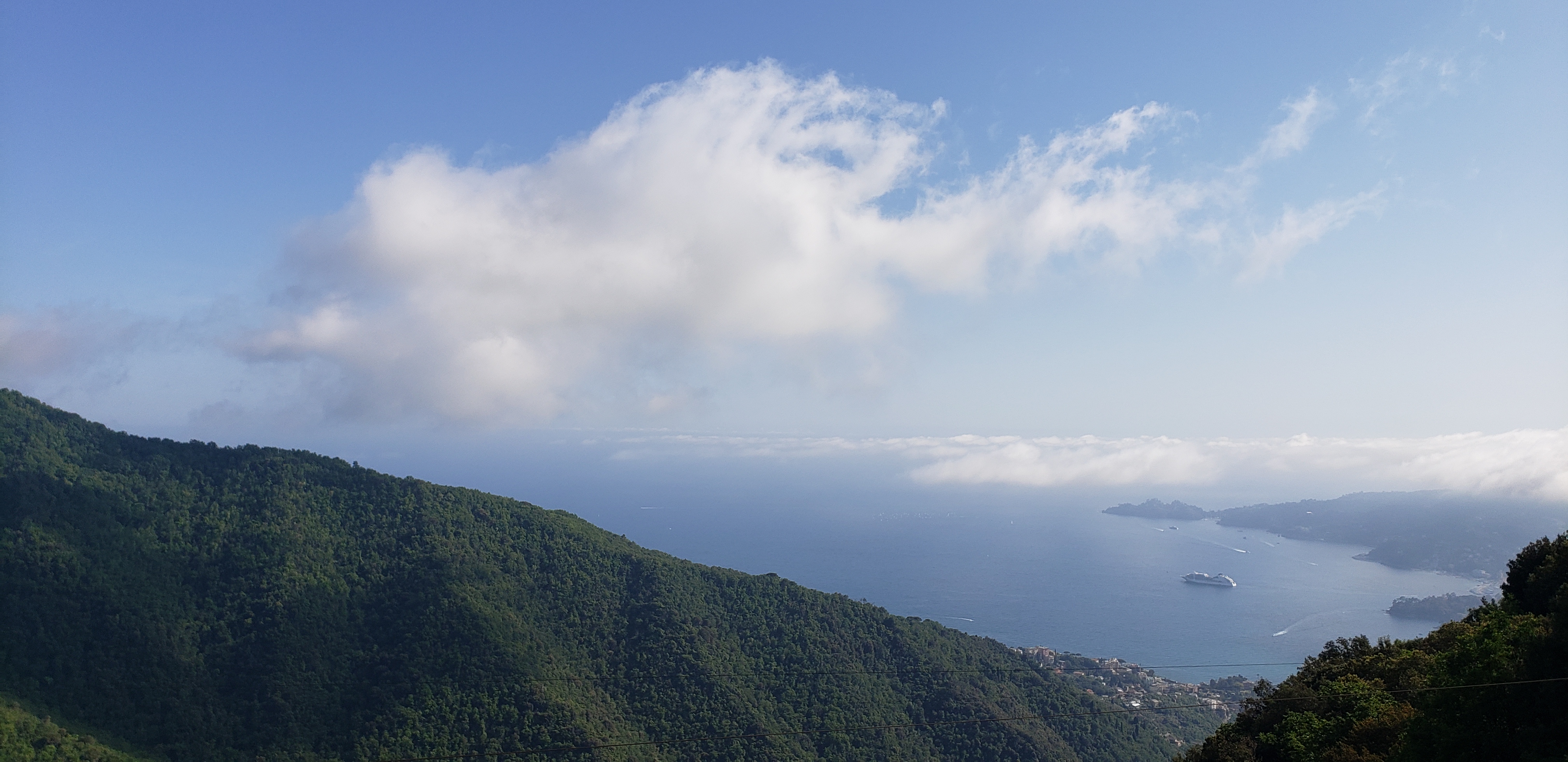 It was a spectacular church and highly advisable to take the cable car up to visit it. Also, from way up here, the views of the green mountains on this clear and sunny day were spectacular. We could also see Rapallo below; it seemed so tiny.