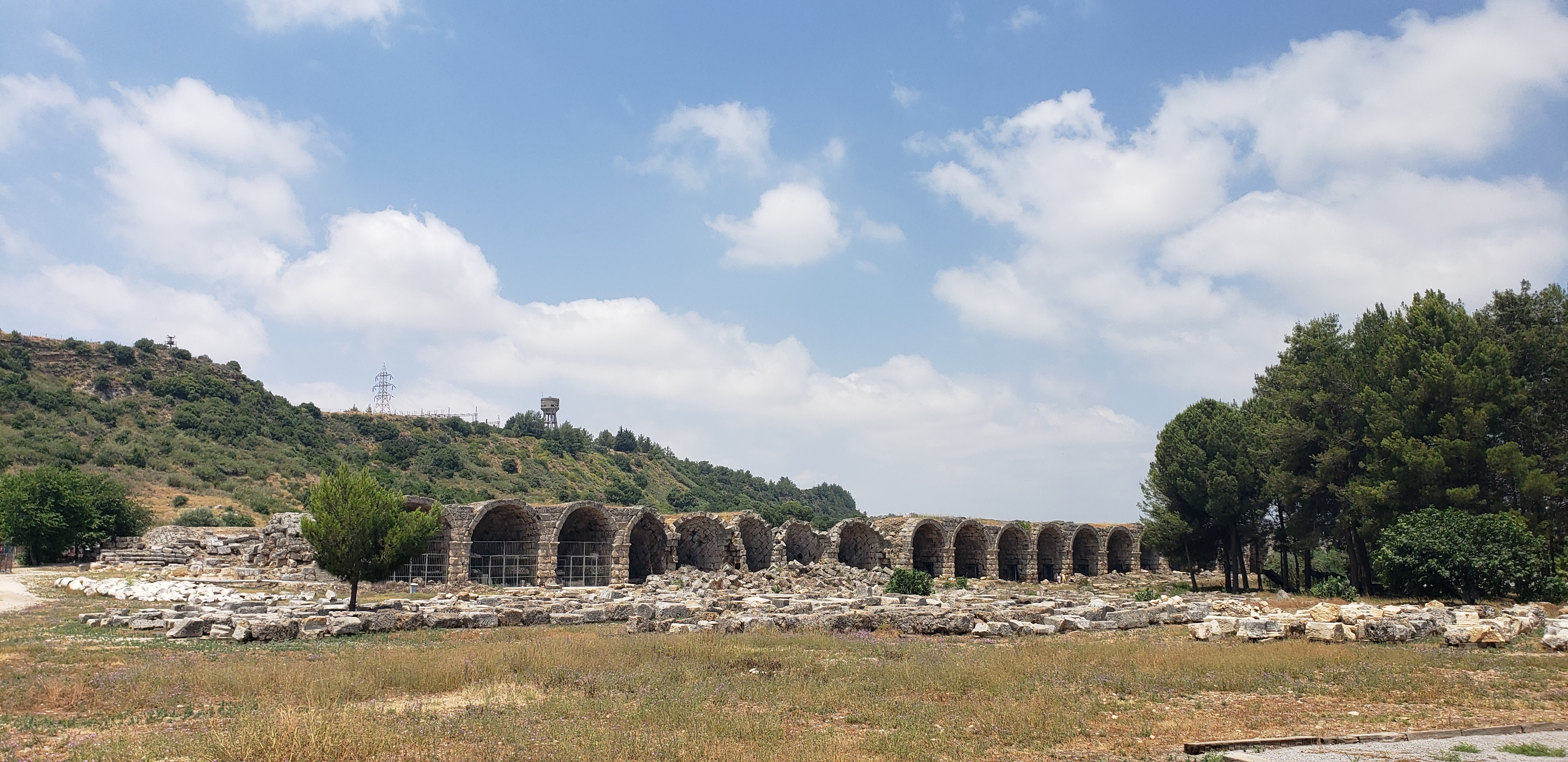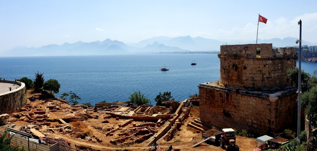 The city then became part of a larger Roman Provence, and the capital of that province was a city called Perge (which Jesse and I visited, but before we get to our Perge visit, we happened upon a second century Roman tower (named Hidirlik Tower) when walking from our hotel to the harbor. There was a bar (aptly named the “Terrace”) that faced the tower, so we had to have a drink and take in the view.