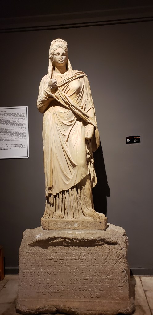 There is also a statue of a woman named Plancia Magna, whose father was a senator and governor of the city of Perge, but she was also known as a Governor of the City and a Priestess of Artemis. There were inscriptions found in the city that said she “spent her money abundantly…and without her husband’s control.” A powerful woman in the city, no doubt.