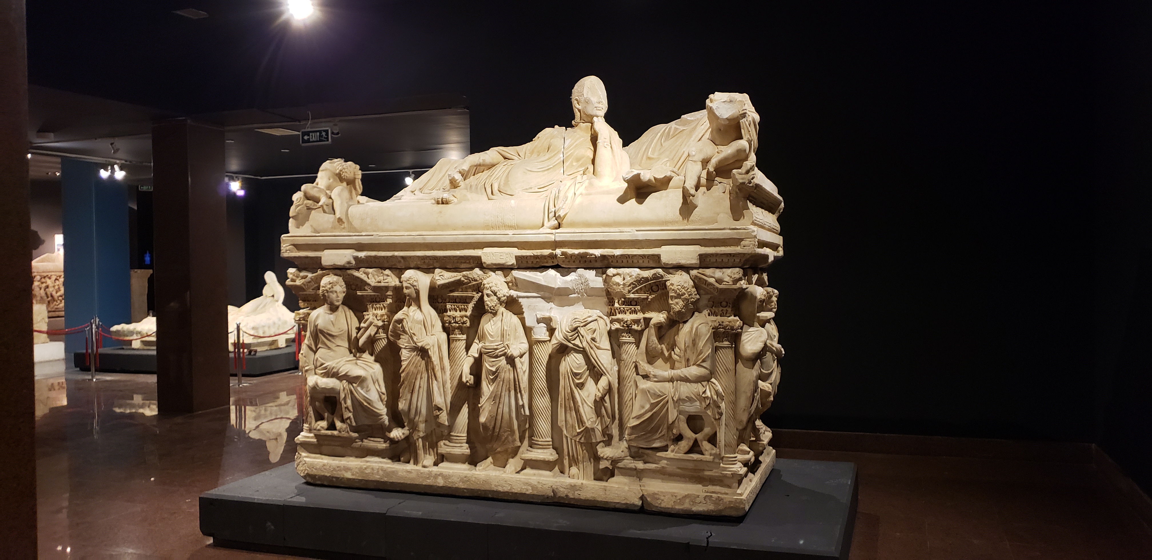 After we examined the many rooms of statues, there is a room with a well preserved mosaic floor and many statue heads that did not have surviving bodies. After that, it was into the grand open room, which possessed many ancient Roman sarcophagi, which were remarkably well-preserved.