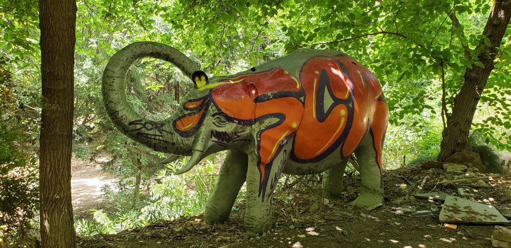 And an elephant statue in the woods near the water (we don’t know what it was doing there):