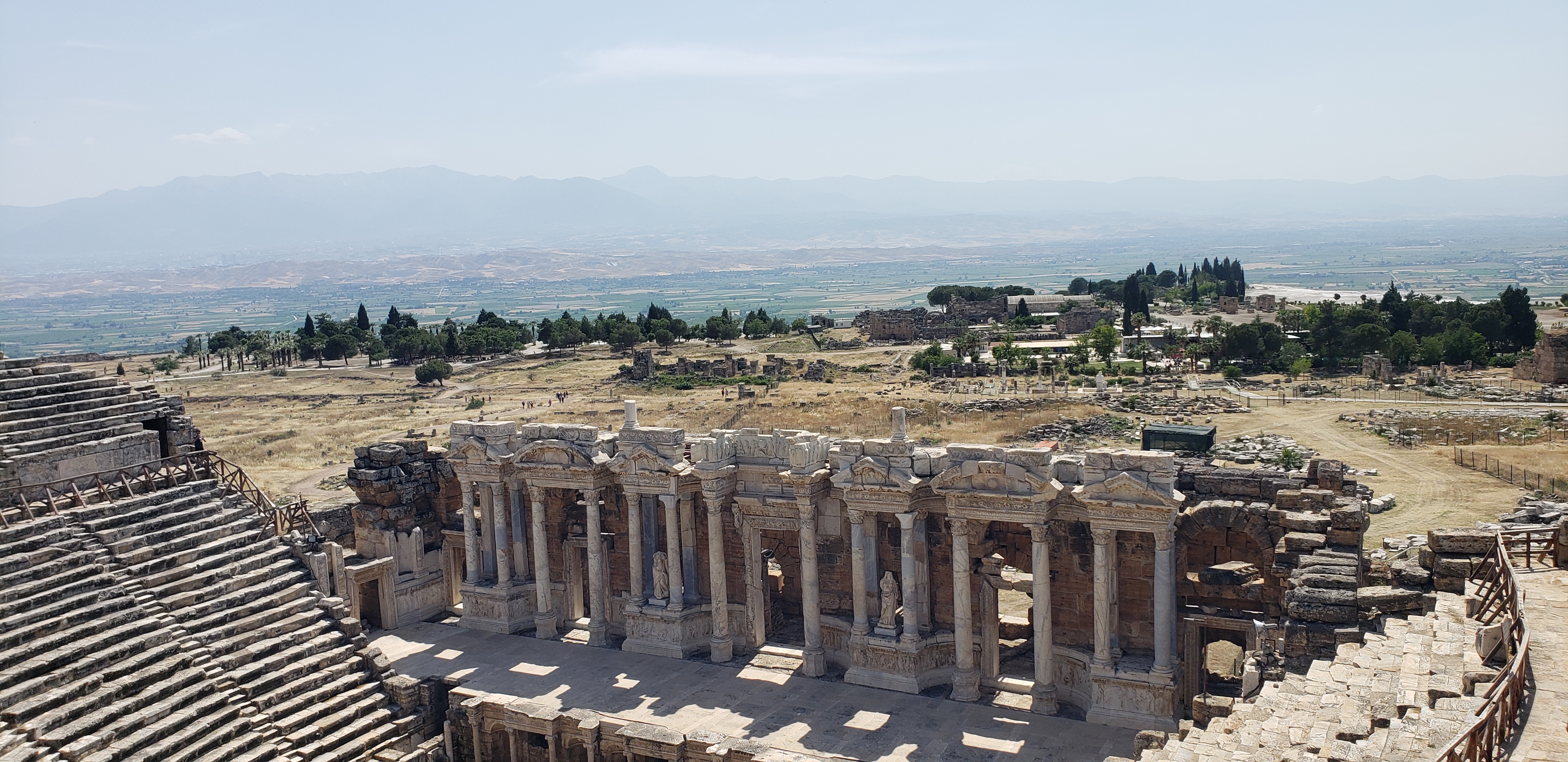 To swim in the warm water where people had been doing so for centuries, is a can’t miss experience. Once we left the pools and changed back into our regular clothes, we had to have some ice cream, which was fruit flavored and quite delicious. As we waited for our fellow tour goers to return to the bus, we took some more pictures of the countryside, and the remnants of the ancient city (the theater is in the center).