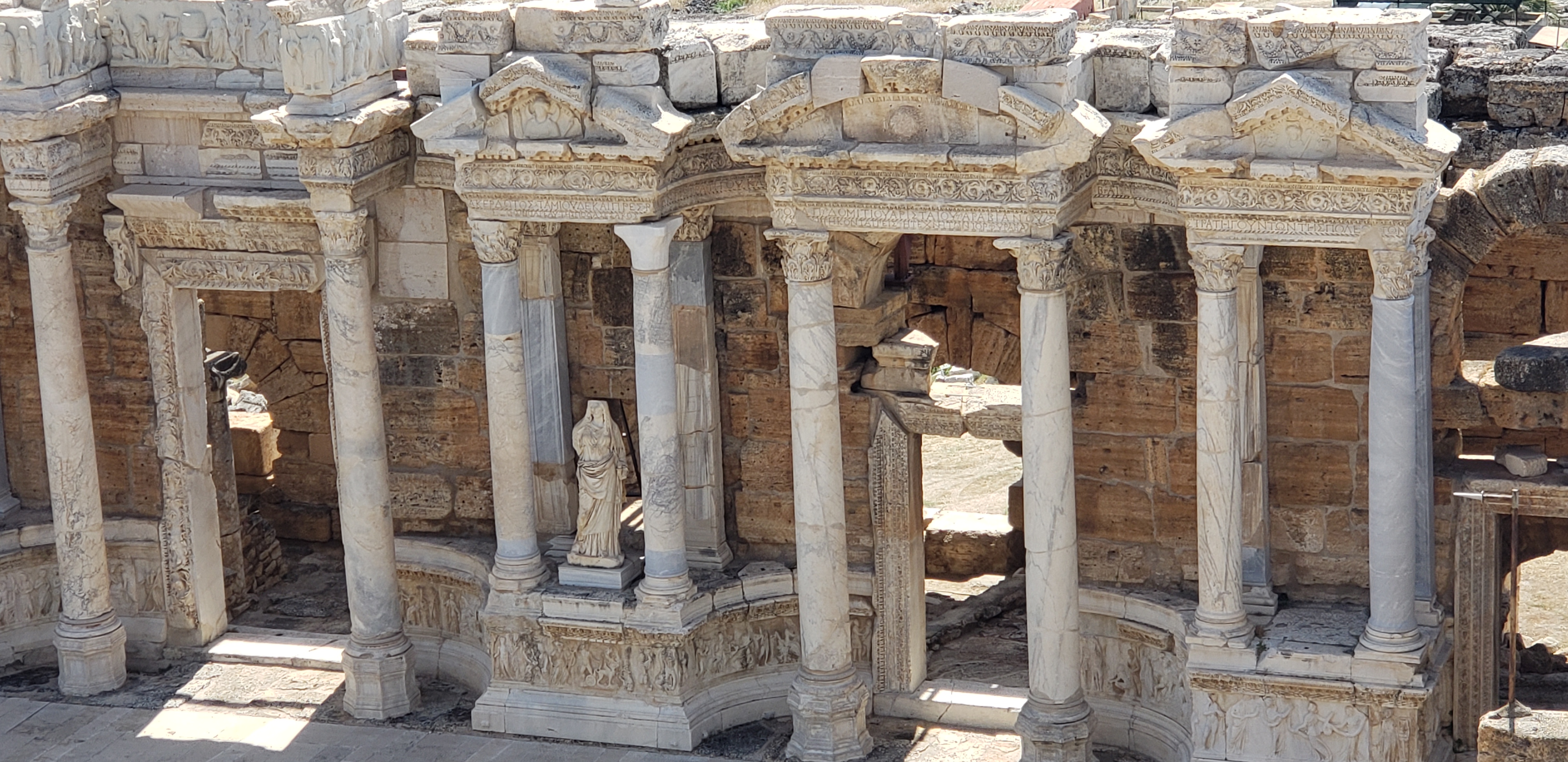 There are about seven terraces, but there were so many people we walked down only a couple, before returning and then exploring the ancient city. After visiting the ancient Roman city of Perge, which was in better shape than Hierapolis, we knew we only really wanted to see the theater, which was in great shape. While there is a picture of it at the top of this post, here is a bit more detail of the statues and archways behind the stage.