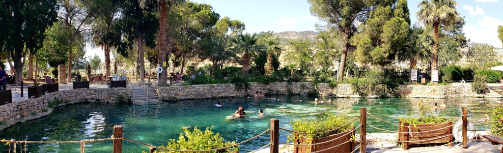 It was quite a hot day, and after the uphill walk to the theater, we were ready to swim in the thermal pools, created by and warmed by the underground volcanoes here, known as the Cleopatra Antique Pools. Hamdi recommended entering the pools after four pm, by which time there would be less tourists and more room to maneuver (and he was right).
