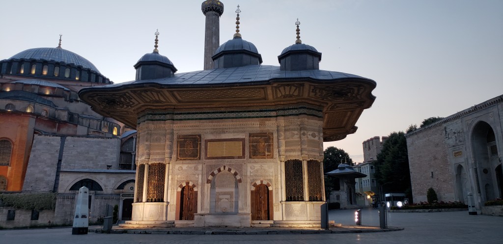 We later walked around the other side of the Hagia Sofia, down Sogukcesme (Cold Fountain in Turkish) Street, which is opposite the tall, stone, garden wall of the Hagia Sofia. The homes are more modern, with panel siding in mint green with white outlines. It is a very posh cobblestone street, and much quieter than the hustle and bustle in front of the Hagia Sofia. At the end of the street is the entrance to the Topkapi Palace and the back of the Hagia Sofia. There is also the fountain of Ahmet III, which is designed in the Turkish rococo style and was built in 1729. It was stunning every time we passed it.
