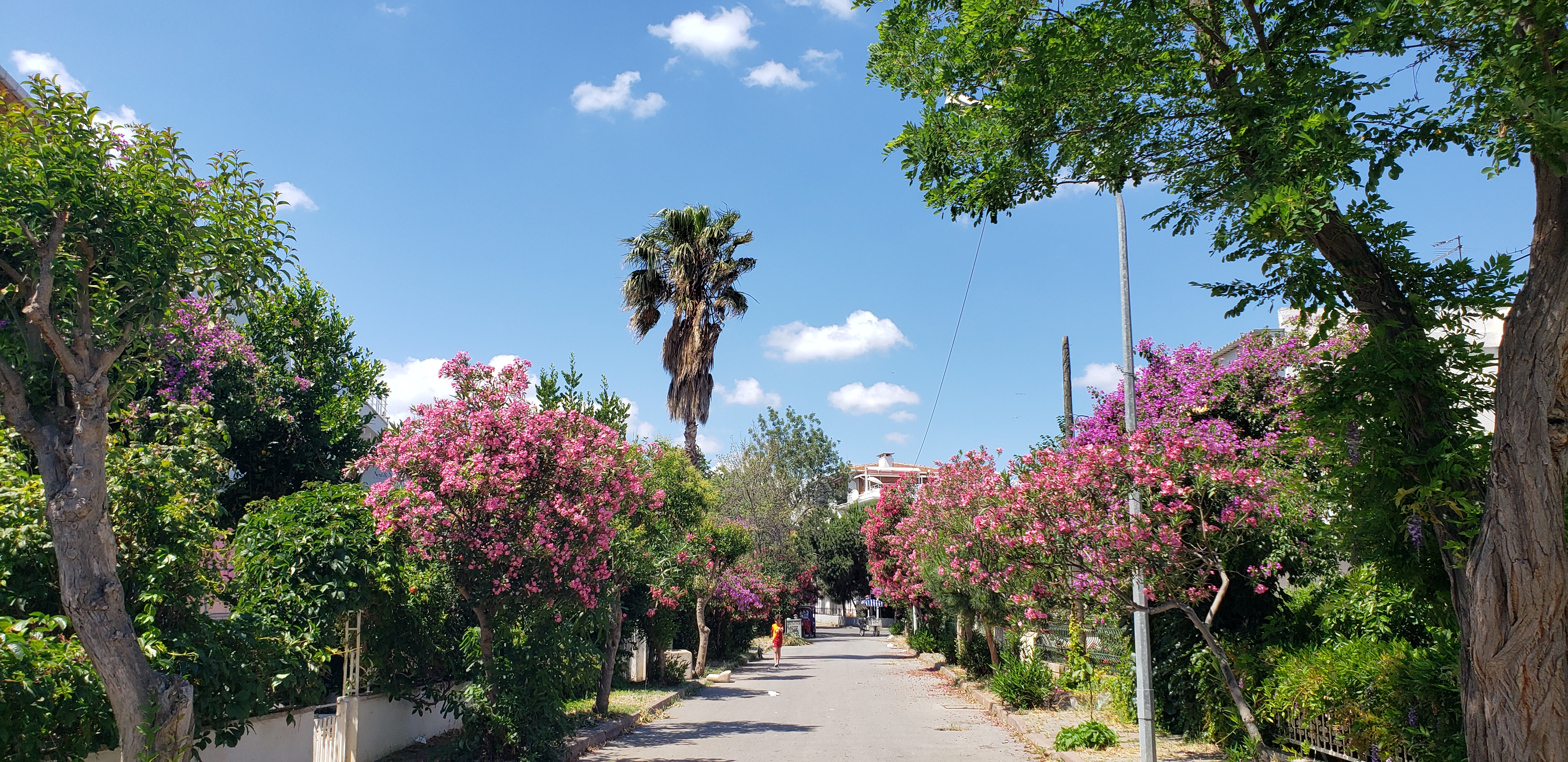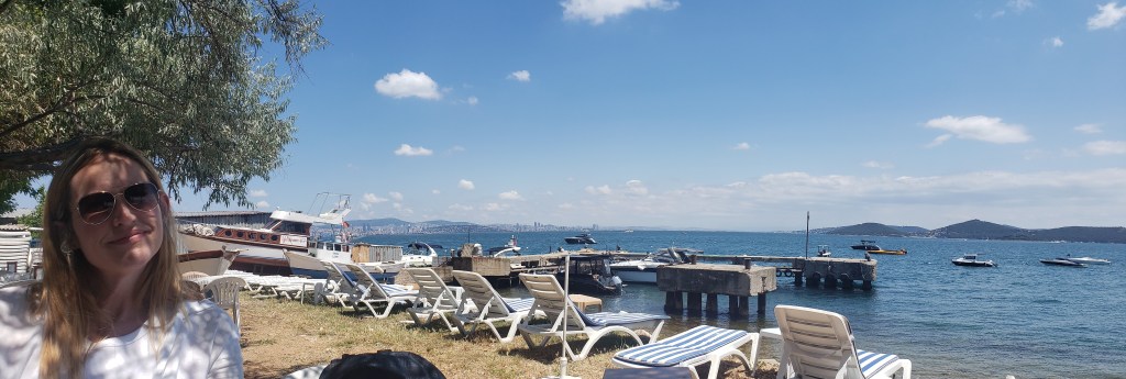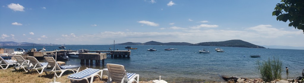 After filling our tummies, we continued walking around the island; passing some fancier and pricier seaside resorts, even one with a crystal clear pool; but we decided against swimming, as we also wanted to see Büyükada, and the time was flying by. So we walked the entire road around the island, eventually returning to the port. We walked down quiet streets lined with bright pink flowers, where sometimes we caught glimpses of the turquoise waters.