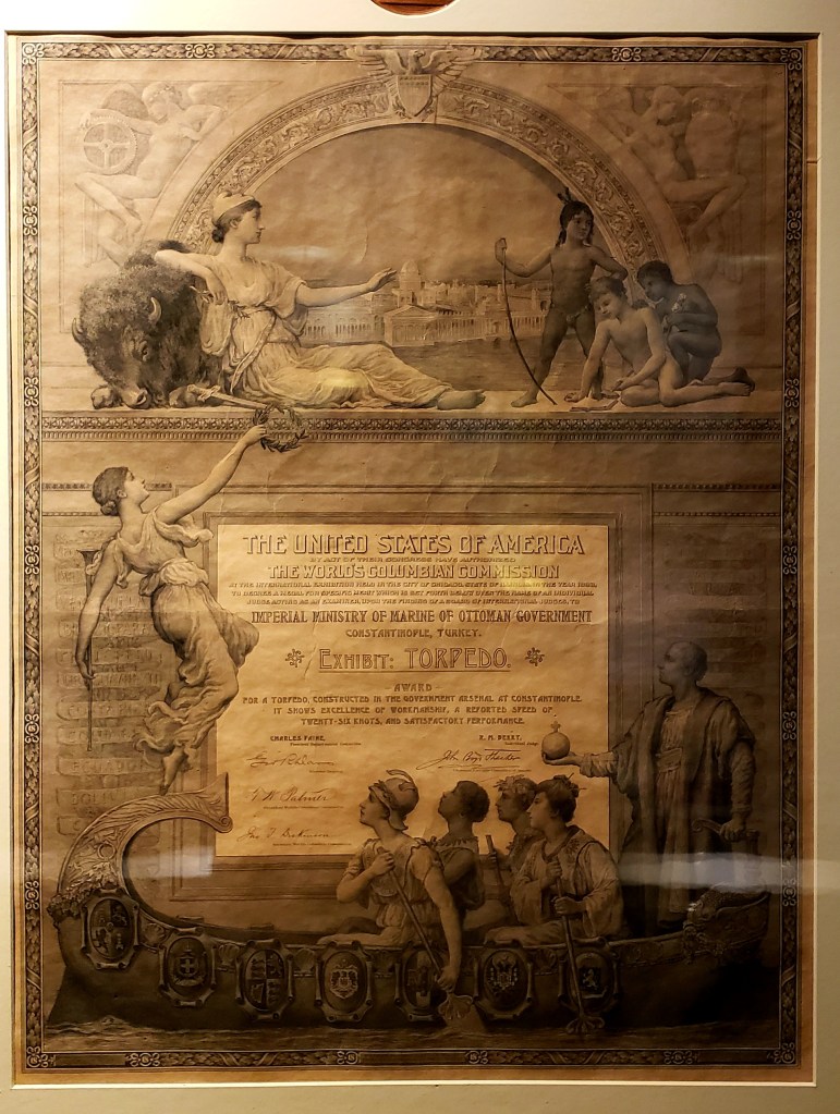 Something else I found cool were multiple certificate awards given to the Ottoman Empire for different naval achievements from the Chicago World’s Fair back in 1893. There were certificates for “Naval Uniforms, Treatise on Mathematical Naval Subjects, and my favorite: Torpedoes.