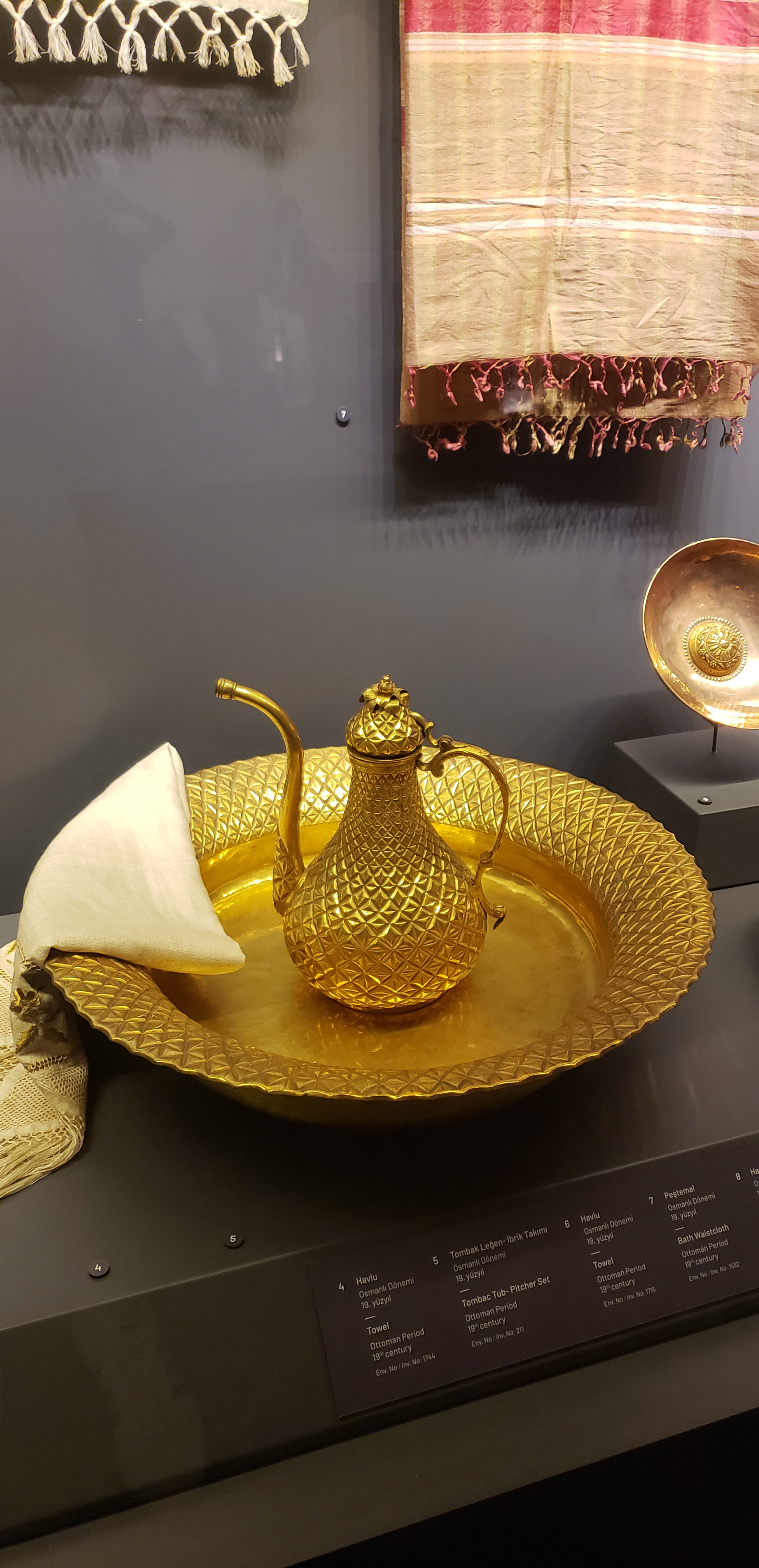 Another exhibit was about the Hammam, or Turkish Baths (which Jesse and I were lucky enough to get to enjoy in Antalya). Below are examples of the slippers worn and a fancy water pitcher used.
