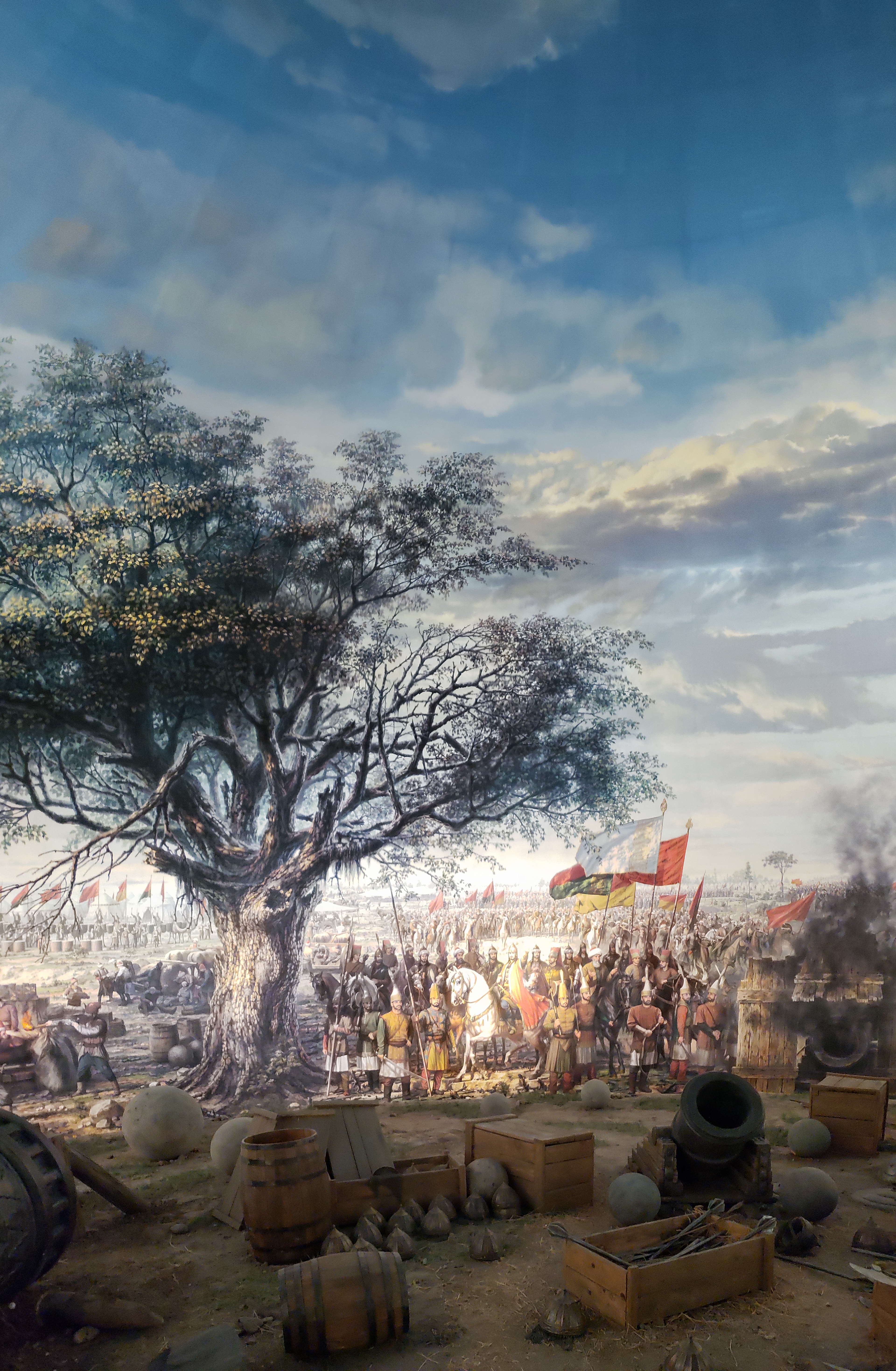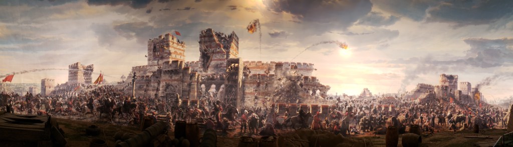 There are pictures and descriptions (and summaries in English), all centered around Mehmed the Conqueror’s conquest of Constantinople in the year 1453 for the Ottomans. But the real star of the show, and what everyone comes to see, is the panoramic dome of the battle. Painted on the walls of the dome are scenes from the conquest; Mehmed is (always) found on a white horse; there are soldiers attacking the walls, more soldiers behind them; and in front of the painting are cannons, arrows, and other battle scene parts, set upon an earthen ring; visitors get to the stand in the middle and listen to explosions and the battle drums and other sounds from the battle. It is an immersive experience, and provides excellent pictures, like these below.
