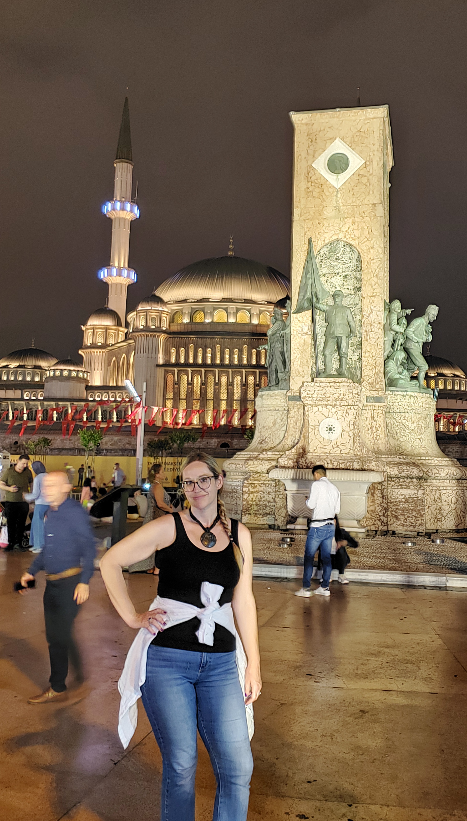 After our best Turkish food meal while in Turkey we walked to nearby Taksim Square, which is where all the cool kids (and tourists) hang out, and there is a large statue dedicated to Turkish workers, the performing arts center and a huge mosque, along with fancy hotels and lots of shopping.