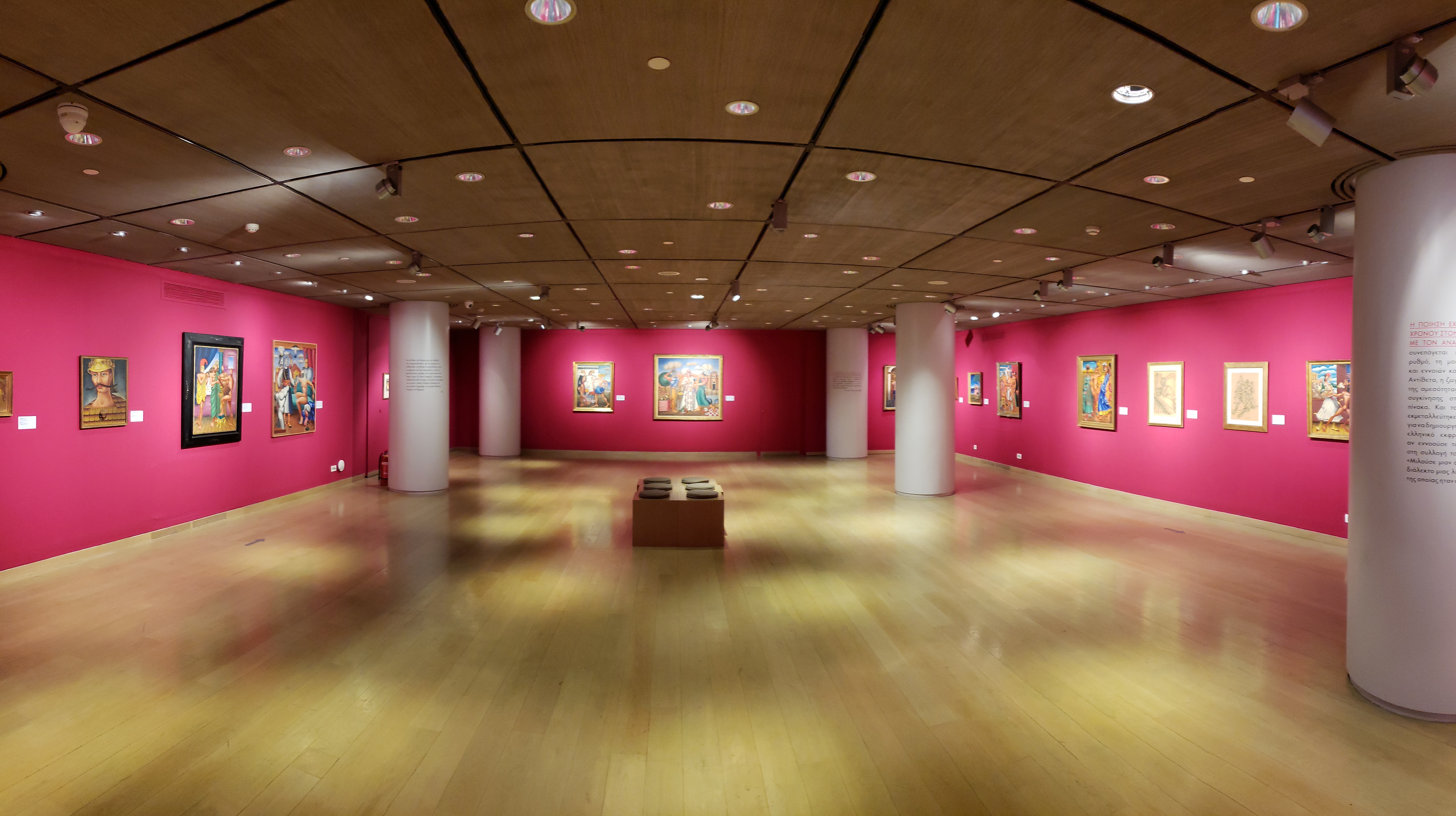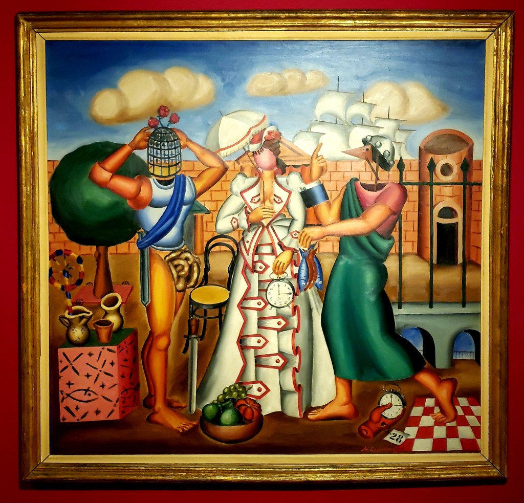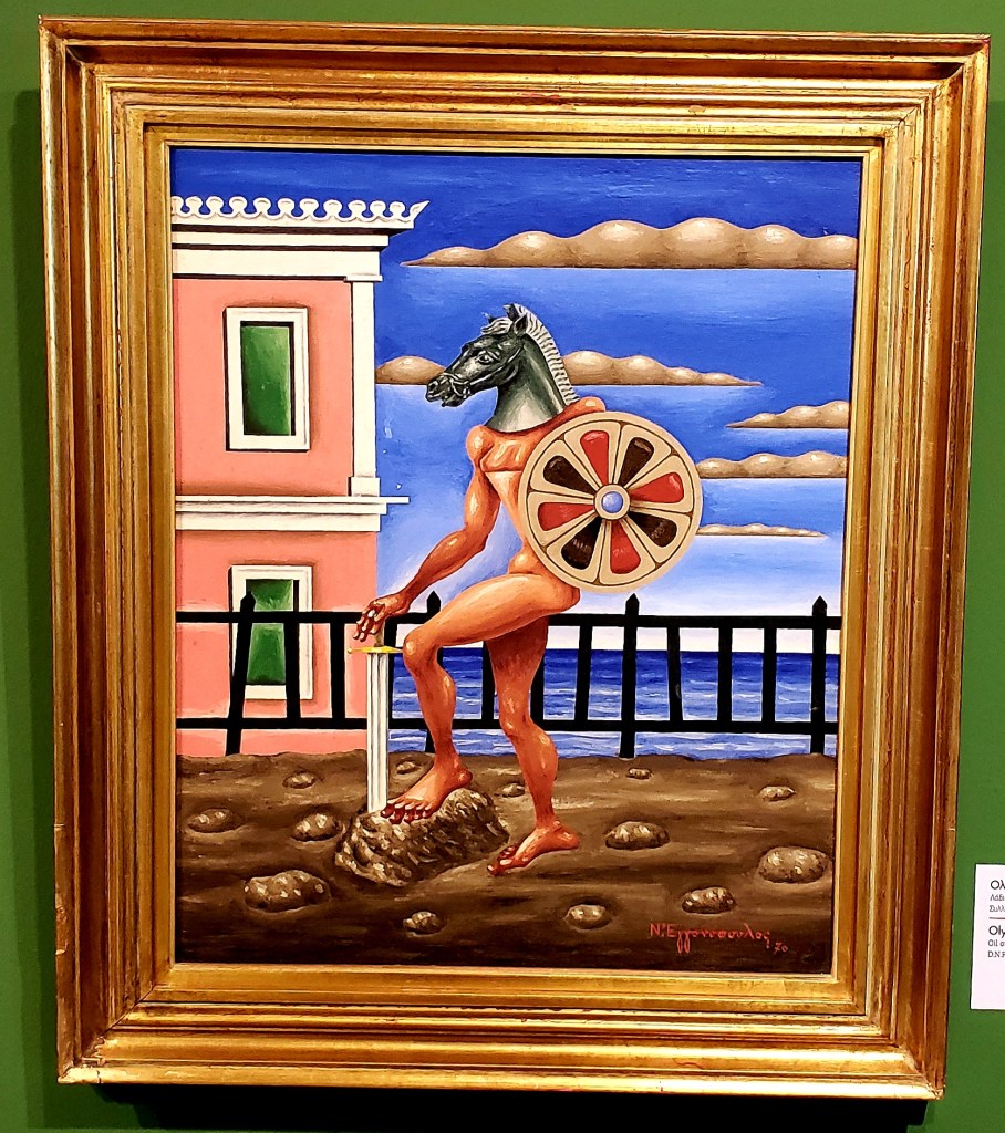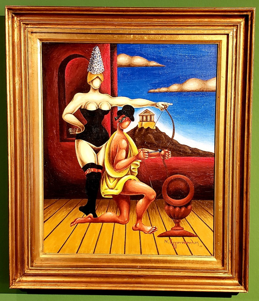 Now energized, we found one more small gallery, which is also an event space, that has a really nice cafe (all the museums and galleries we visited had really nice cafes, and cafe/coffee culture is a big part of Athens, as there are coffee shops absolutely everywhere), called the B. & M. Theocharakis Foundation for the Fine Arts & Music. They had temporary exhibitions, a friendly staff, and we were lucky enough to get to learn of the Greek surrealist painter Nikos Eggonopoulos. They had a two floor exhibition, and we have another favorite artist. The brightness of the colors, and the amount of his paintings on display, was awesome.