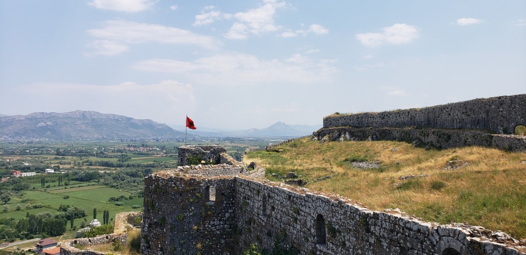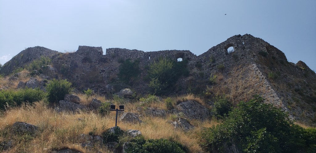 After our trip to the mountain village of Theth, we drove back down the mountain, past the town of Shkodra (or Shkodër) to our next guesthouse, located directly on Lake Shkodra. But first we stopped at Rozafa Castle, which is located in the city of Shkodra, which is also the name of the municipality as well. Rozafa Castle is about 430 feet (or 130 meters) above sea level, and sits high above the city of Shkodra.