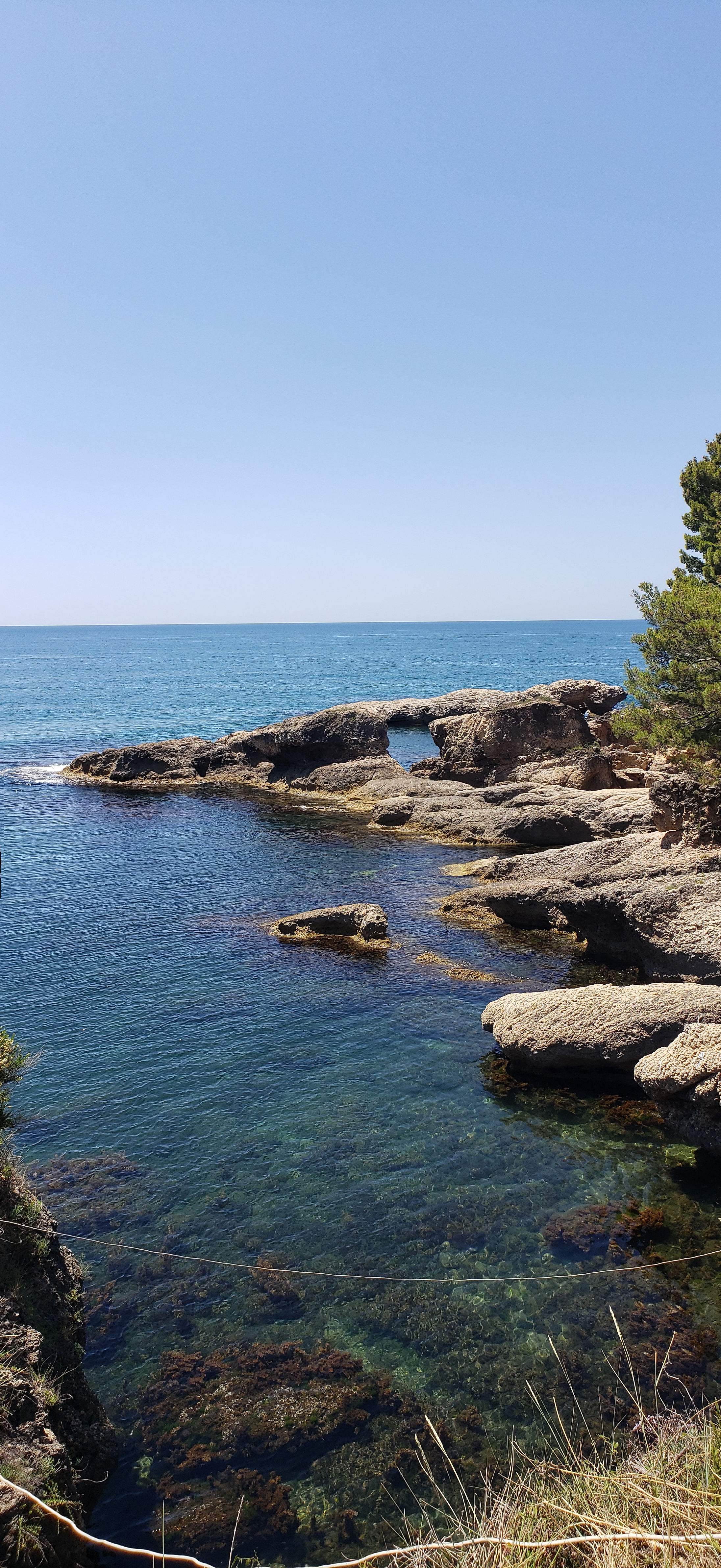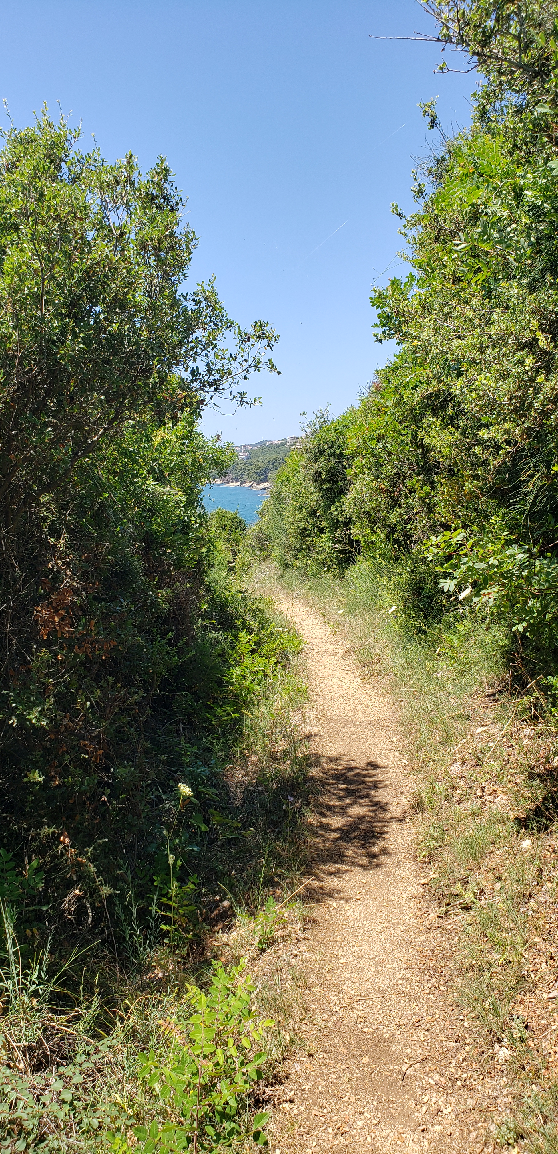 The town was very busy when we arrived, but I had not time to plan what to do; I saw a trail walk called the Long Beach trail (and since Jesse and I lived in Long Beach for five years) thought that sounded like a good walk. I also assumed, as it ran along the Adriatic Sea, that it would be a beach walk. Well, it was not, but the sea was almost always in our view, sometimes covered overhead by trees, oftentimes not. In total, the hike was two kilometers. It was tiring and we were sweaty on the hot day, but the breeze and the views made it enjoyable.