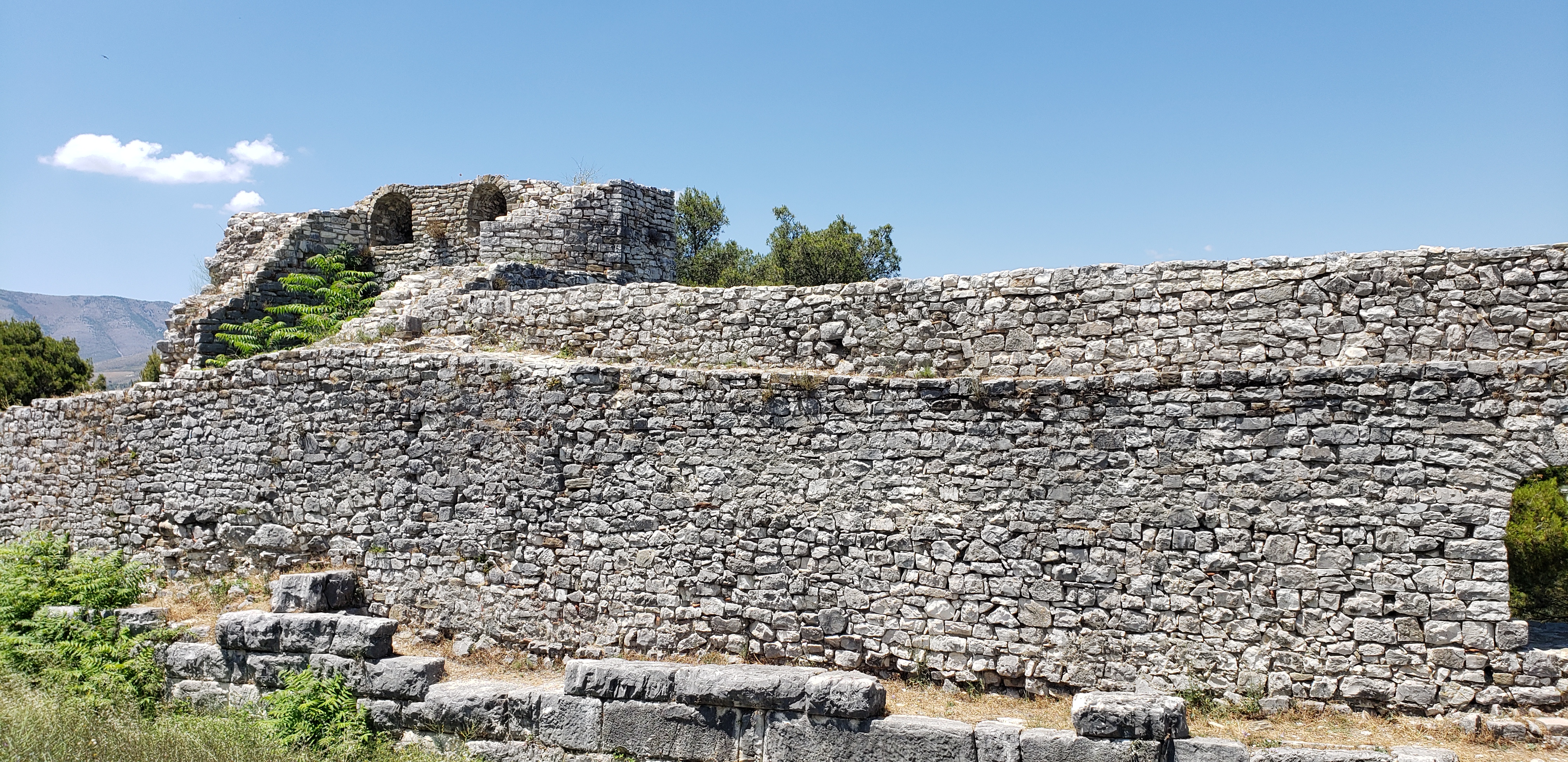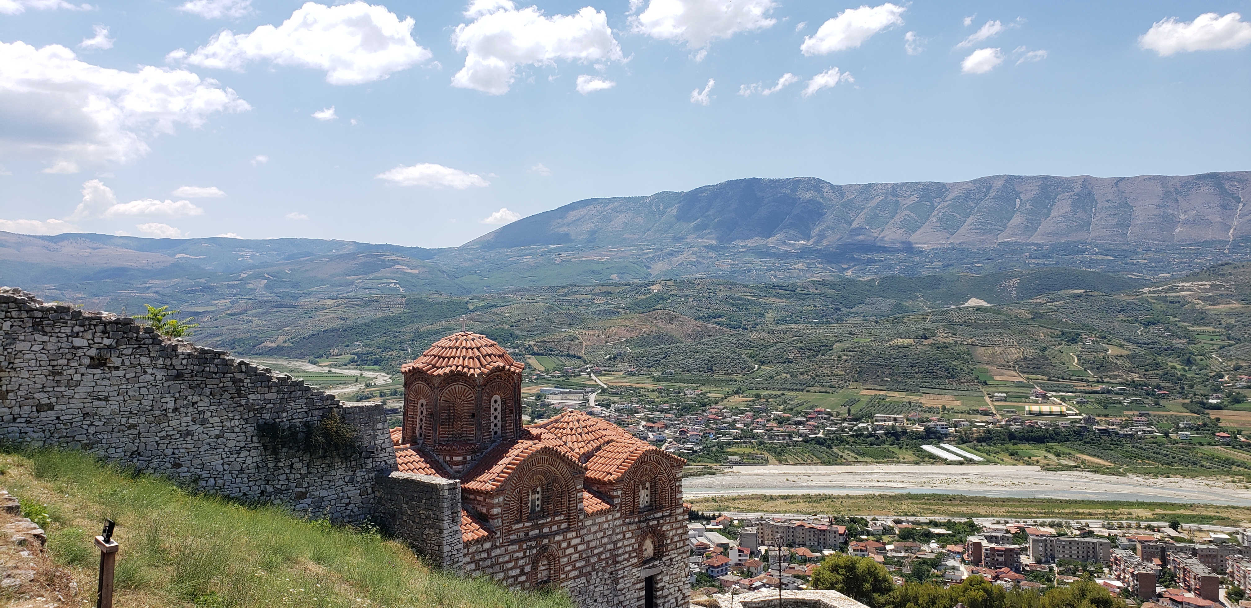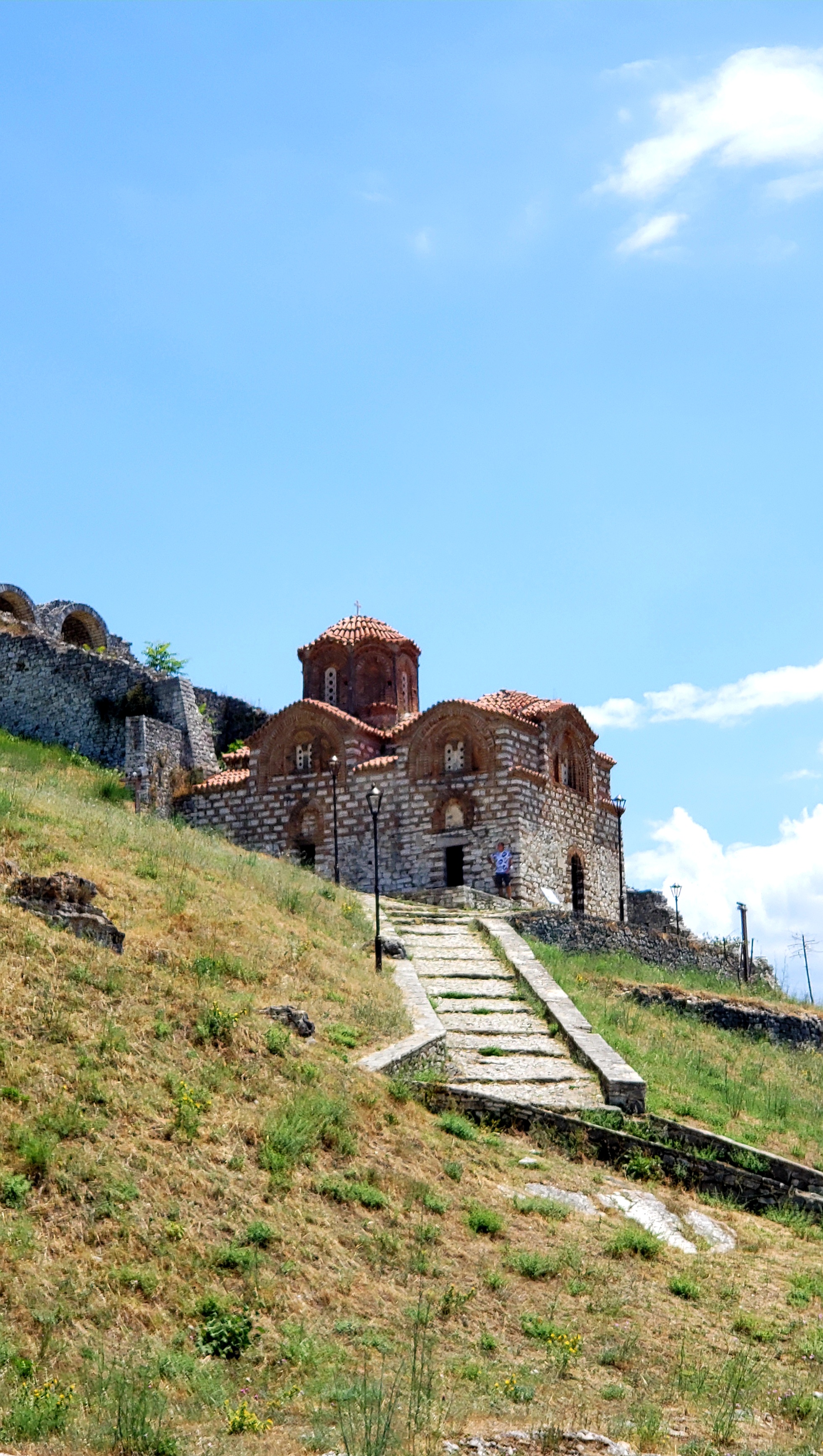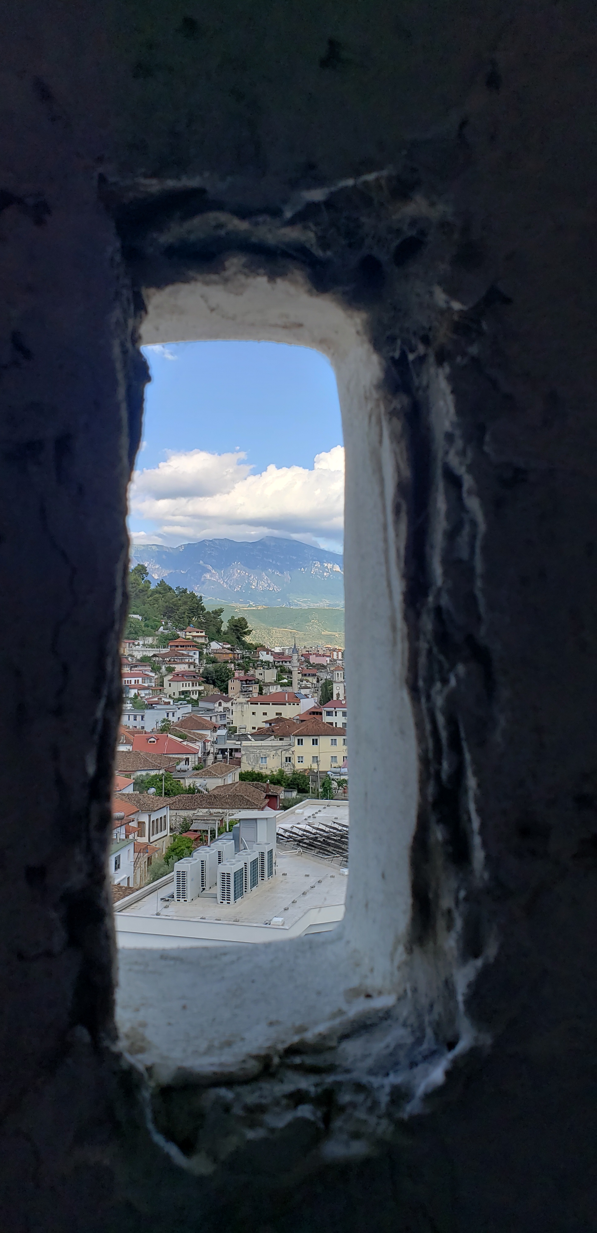 After that climb we decided our next day’s trip was up to Berat Castle, which is an even greater climb itself (700 feet, or 214m above sea level). One can drive to the gates, but we decided to walk; instead of walking the whole way on the cobblestone streets, we took a slight shortcut trail on a dirt path that zig-zagged its way up to a side entrance. Here is the view once we reached that entrance: