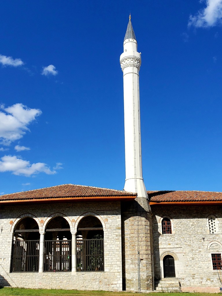 After we finished, we met the caretaker outside the mosque. Jesse was going to cover her hair, but he told us it was ok, they were liberal Muslims here in Albania. He saw a group of tourists approaching, told us they were Spanish, and when he asked if they were, they confirmed it; then he said he didn’t speak Spanish, so spoke to them in Italian, which, by the looks on their faces, they kind of understood. He was funny and personable, and after he told them to head over to the Halveti Tekke, we took off our shoes and went inside the Mosque.