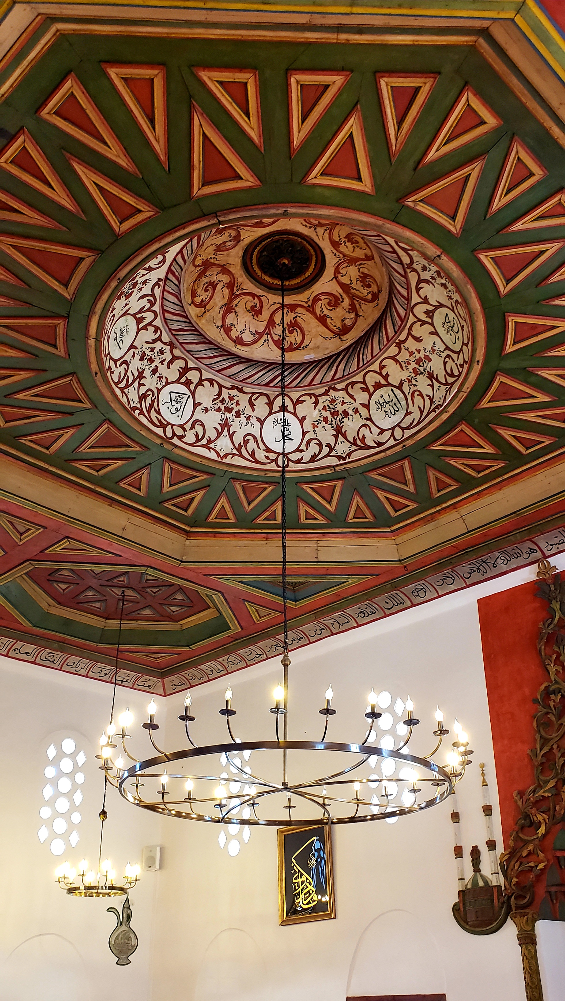 We were let inside by a friendly, older, bald man with only a few teeth, who spoke just enough English (and he spoke some Italian and German as well) to tell us about its history. He left us to take pictures, and told us to meet him at the Xhamia e Sulltanit Mosque that was across the stone courtyard from the Halveti Tekke when we were ready. The detail on the ceiling was so cool, and zooming in on the pictures below is a must.