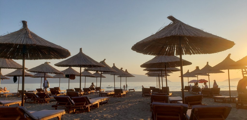 He was from Kosovo, which was part of Yugoslavia but inhabited by Albanians; he and his family had to leave Kosovo for Germany back when the war there occurred. He held the US in high regard, telling us that George Bush had visited Vlora and that he liked our country very much. He spoke seven languages, including Spanish, so we spoke with him in Spanish a bit, and then we got out of the water and he introduced us to his son, who lived and worked in Germany. We had a nice conversation before returning to our beach chairs.