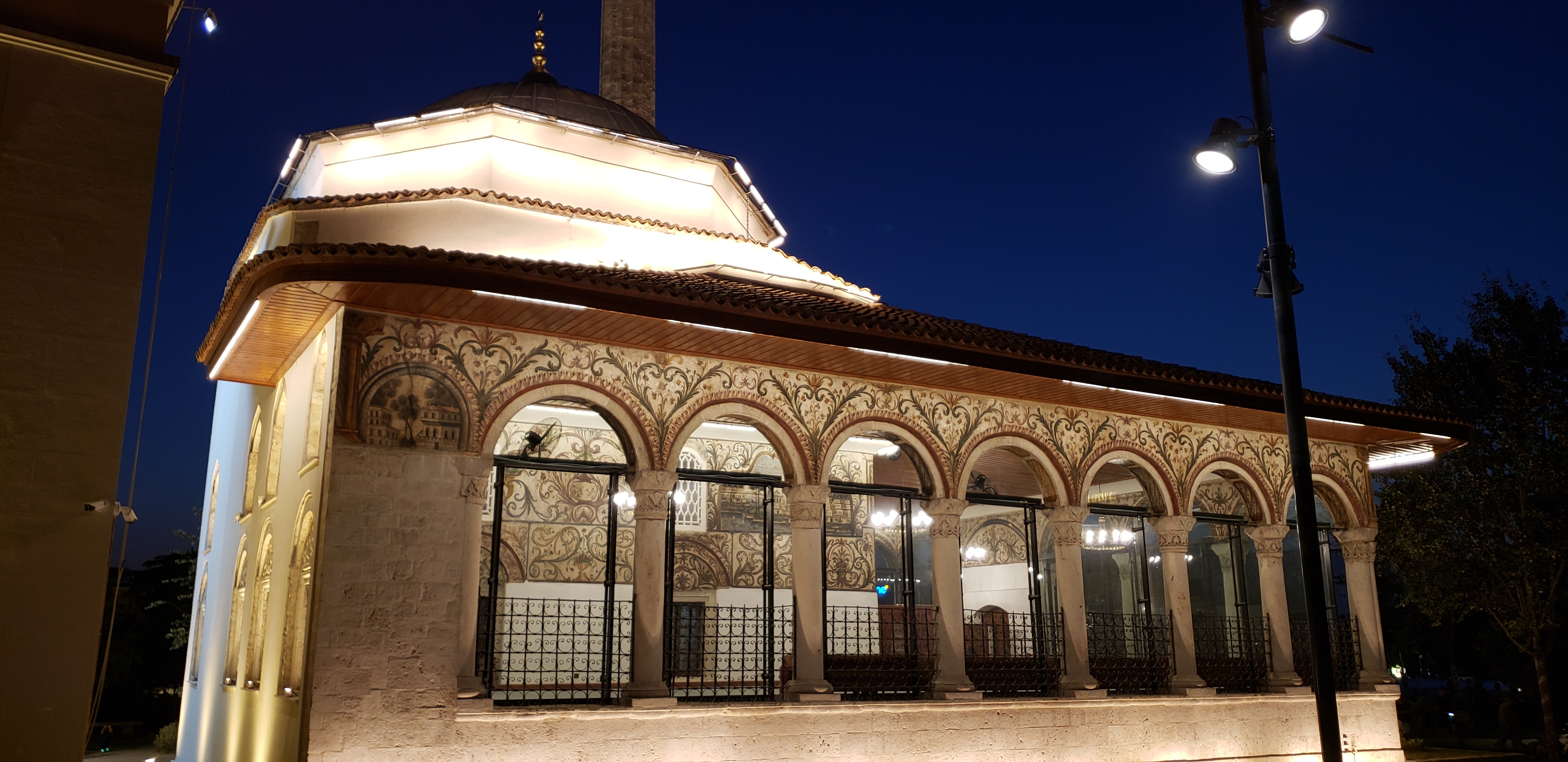 the outside of the Et’hem Bej Mosque, dating back to the 18th century: