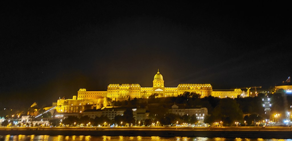 Another evening, Jesse and I booked a tour on the Danube River, complete with bottomless Prosecco, which was a pure delight. We arrived at the boat about thirty minutes before, watching the last tour group exit the two-level ship while our group waited to board. Jesse and I made our way to the top deck, and snagged the last two person table; we had a great view and glasses of Prosecco were waiting for us (along with a large bottle of water). We started down the Danube, half listening to the recorded audio tour that could barely be heard above our fellow revelers, but we were here for the sites. It is really a great way to see both sides of Buda and Pest, with a lively atmosphere and all the buildings and bridges on both sides lit up. We first saw the Parliament Building from far away: