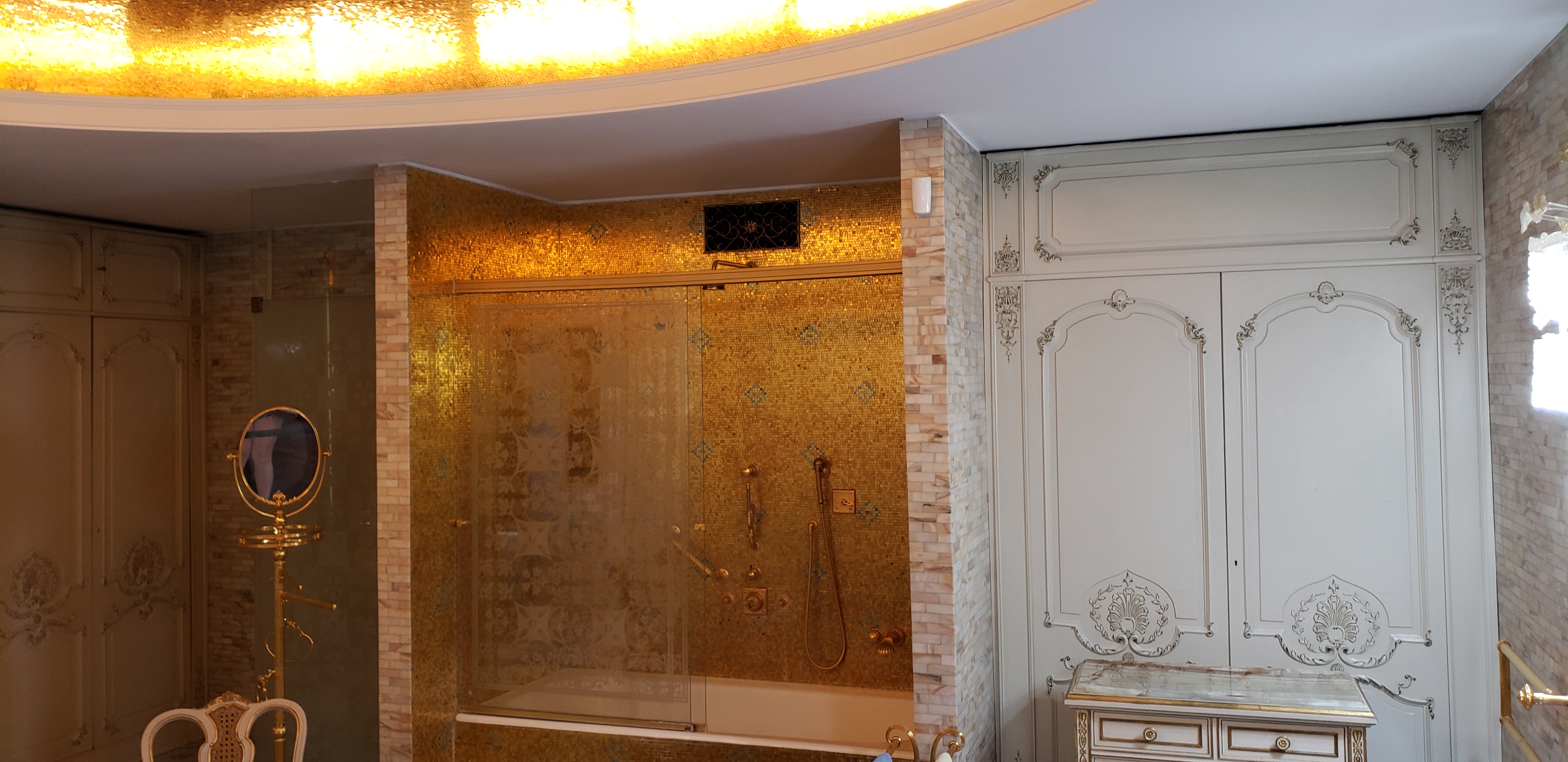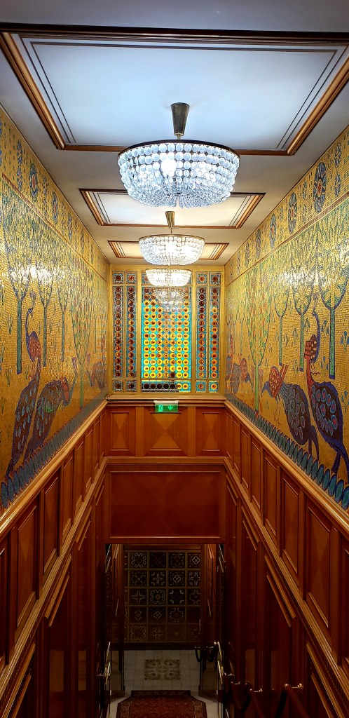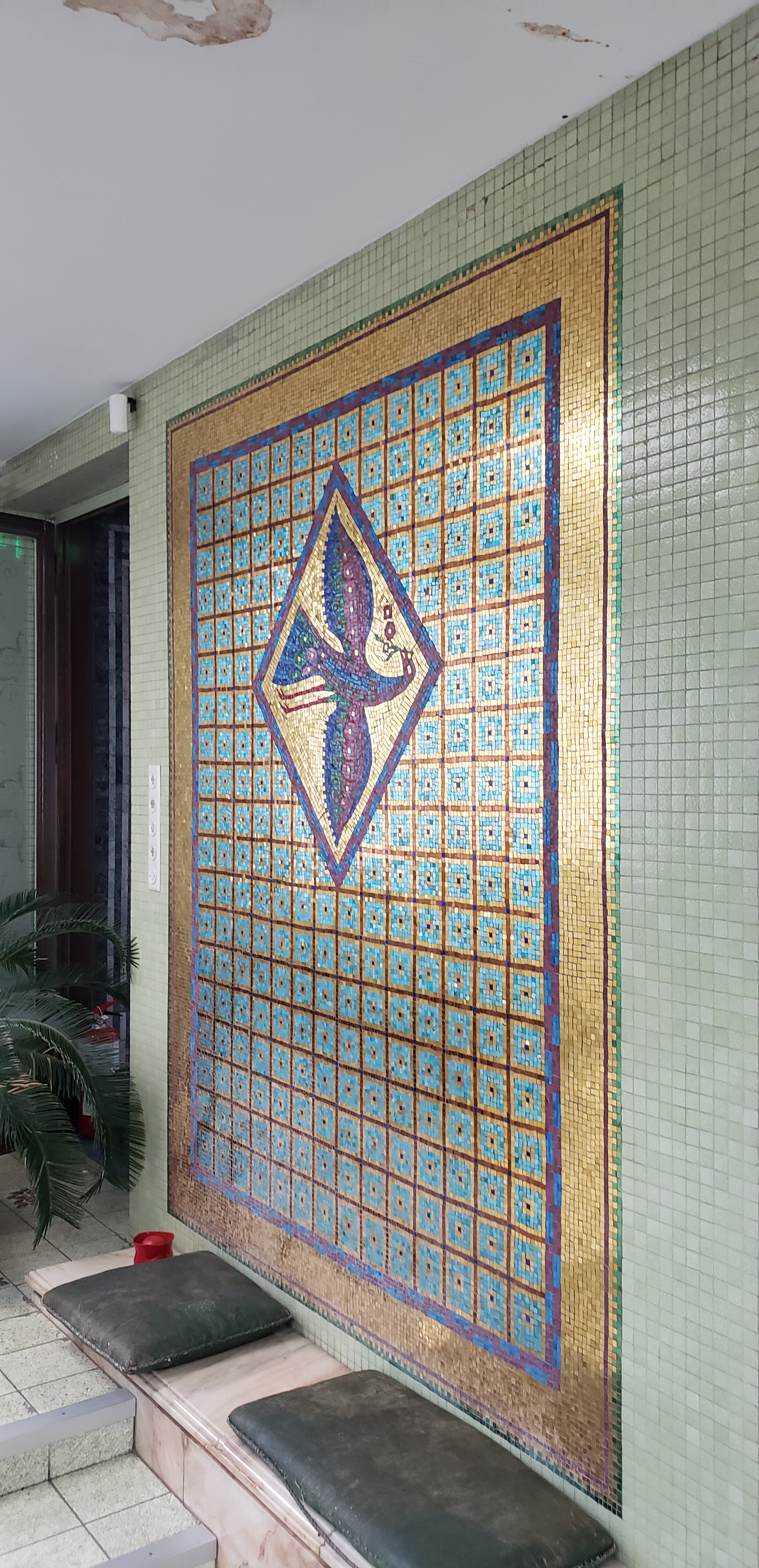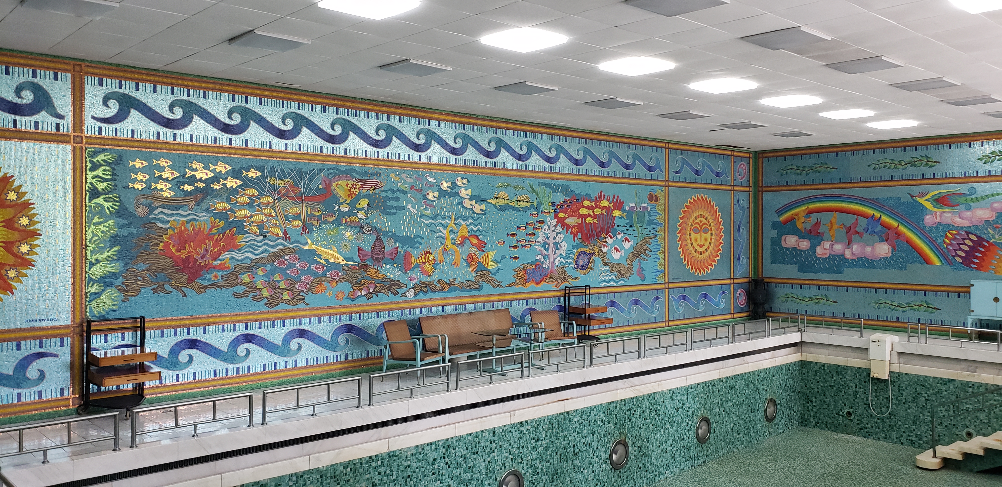 The pool area mosaics are straight out of the 70s, with star signs and fun suns, fish, and of course, a peacock.