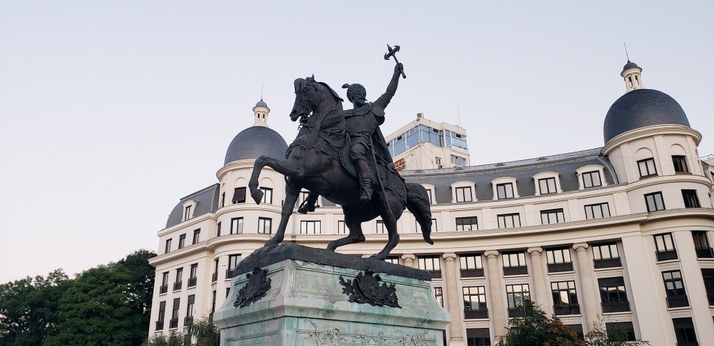 The statue is of King Carol the first of Romania. His story is interesting, as he was born Prince Karl of Hohenzollern-Sigmaringen (in Germany), and was chosen by Romanian leadership to be the Prince of Romania in 1866 (which he accepted), and later was made King when the Russians drove the Ottoman Turks from Romania. Carol is held in high regard as he brought modernity to Romania. Across from the Statue is Romanian National Museum of Art (below) and a statue dedicated the people who died during the Romanian Revolution in 1989, located in Revolution Park.