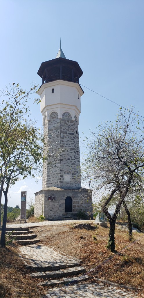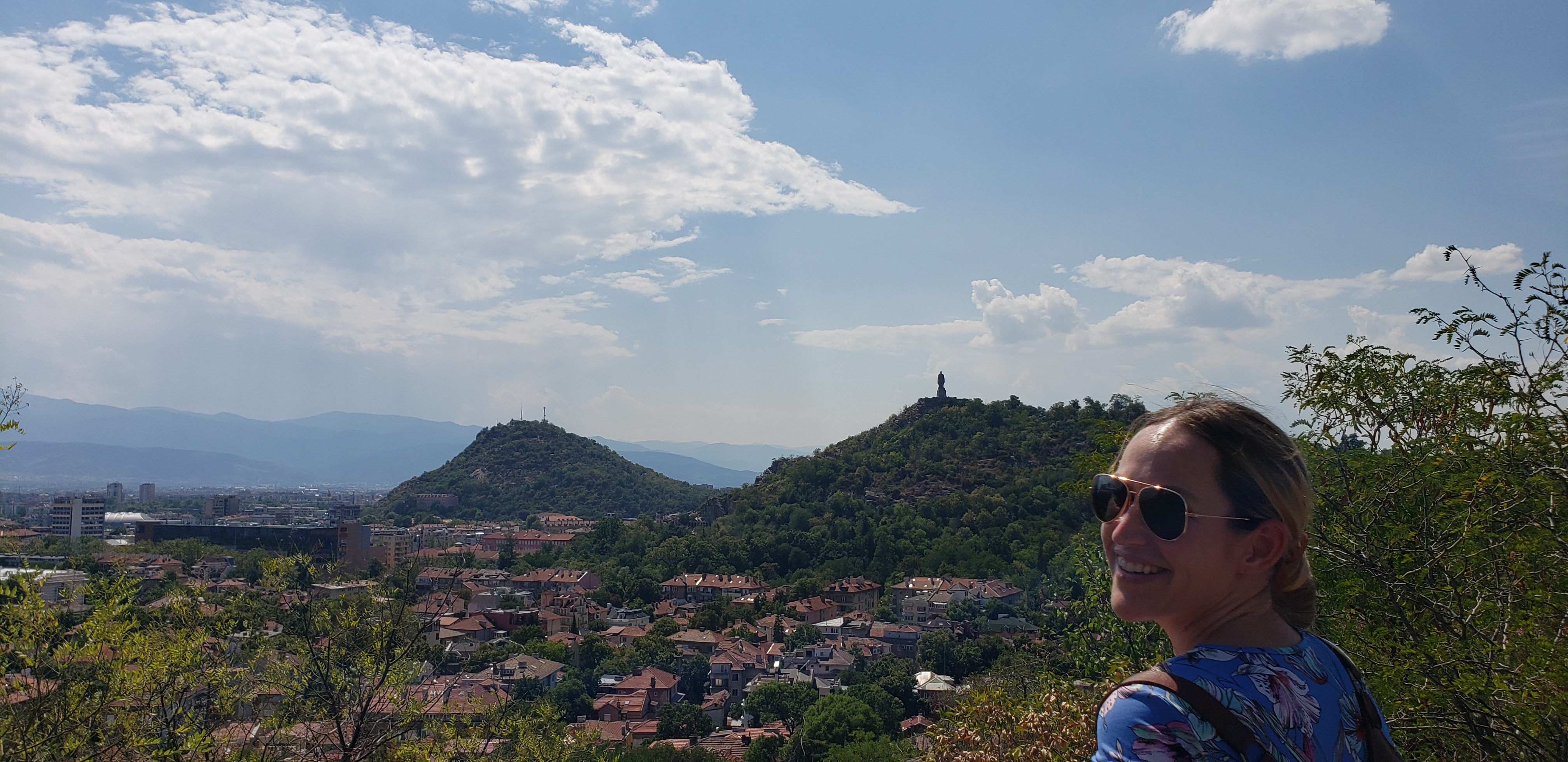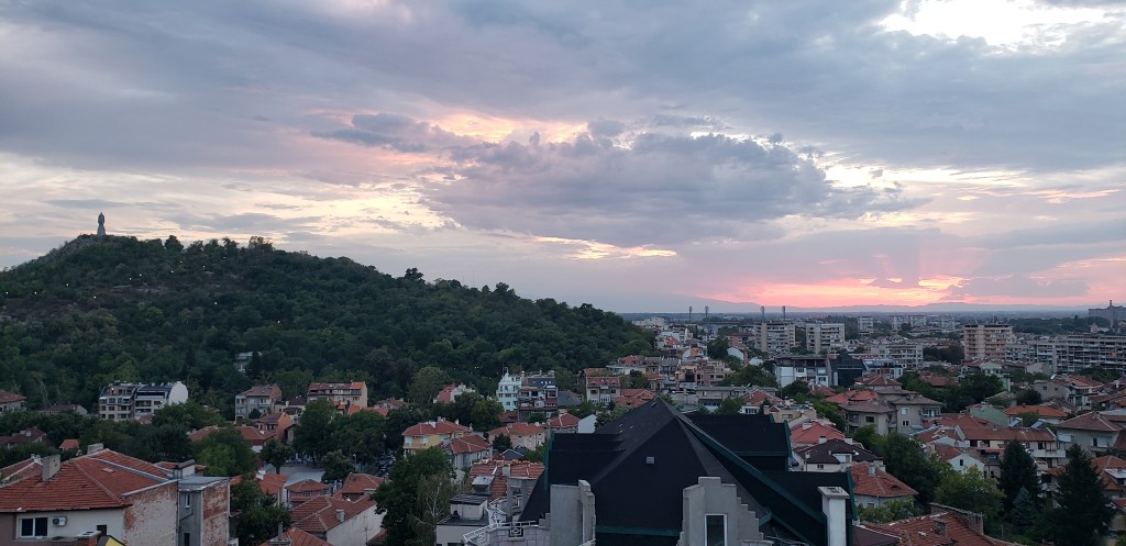 We could see our hotel from the Clock Tower (it is on the left side of the second picture above), so we followed a path down until we saw our hotel. After much needed showers we walked back to Kapana and found the grocery store Billa (which we visited a few times here and in Sofia as well). They had a hot food case in their deli, so we bought some cheap dinner, along with other supplies, before heading back just before sunset to the hotel. Our hotel had a huge, two floor roof terrace, which was set up, or was once used, as a bar and maybe a restaurant; but now it wasn’t used for anything, except providing us a nice view right after sunset (we made it to the statue on the lefthand side if the picture below later in our visit), which capped off an interesting first day in Plovdiv.